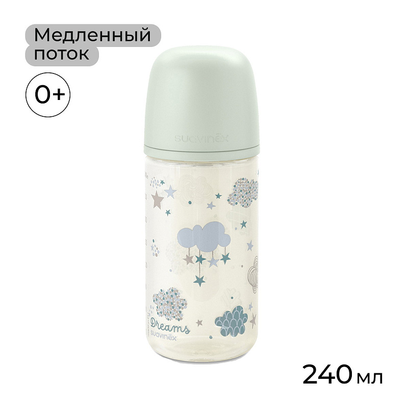 Стеклянная бутылочка для кормления Suavinex Dreams 240 мл, медленный поток, 0 мес+ 308240 BLUE