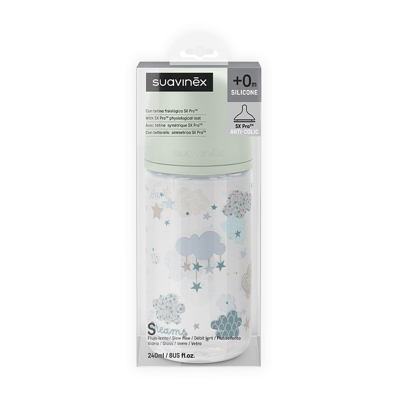 Стеклянная бутылочка Suavinex с физиологической соской SX Pro делает процесс кормления максимально естественным и помогает предотвратить возникновение коликов.