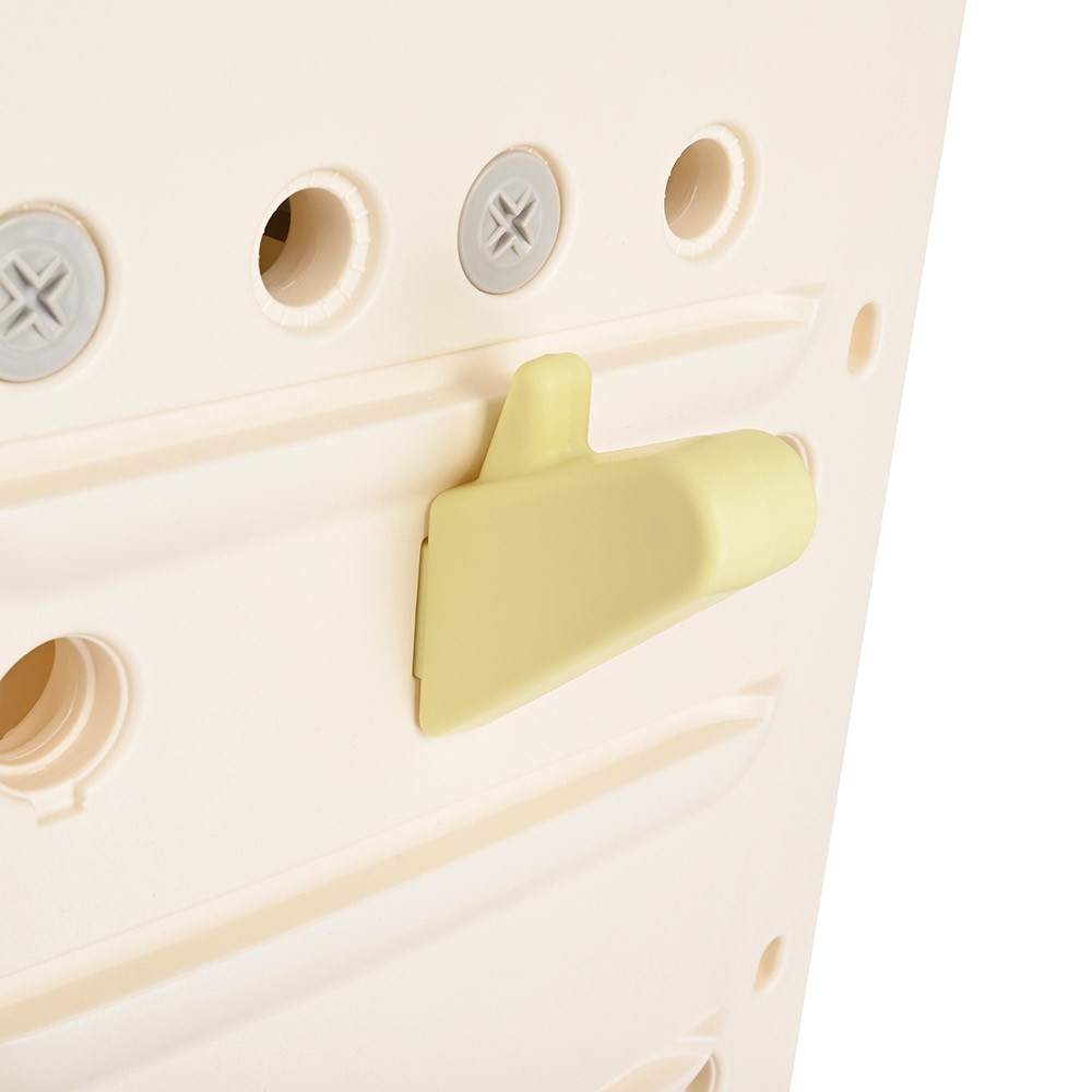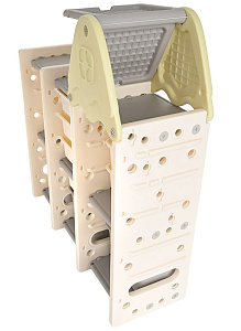 Стеллаж для игрушек с ящиками и полками выполнен из качественного пластика. Данный материал экологичен и прост в чистке. Небольшой вес стеллажа и его устойчивая конструкция обеспечивают ребёнку безопасность от ушибов.