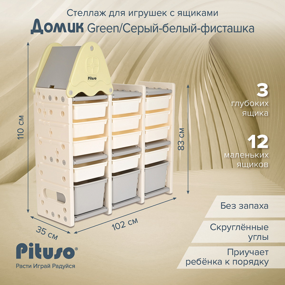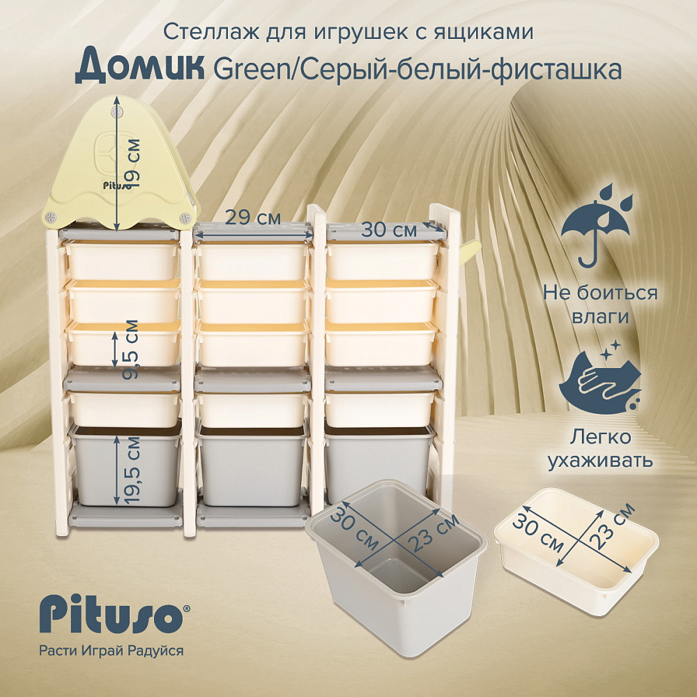 Стеллаж для игрушек Pituso Домик с ящиками Green/Серый-белый-фисташка