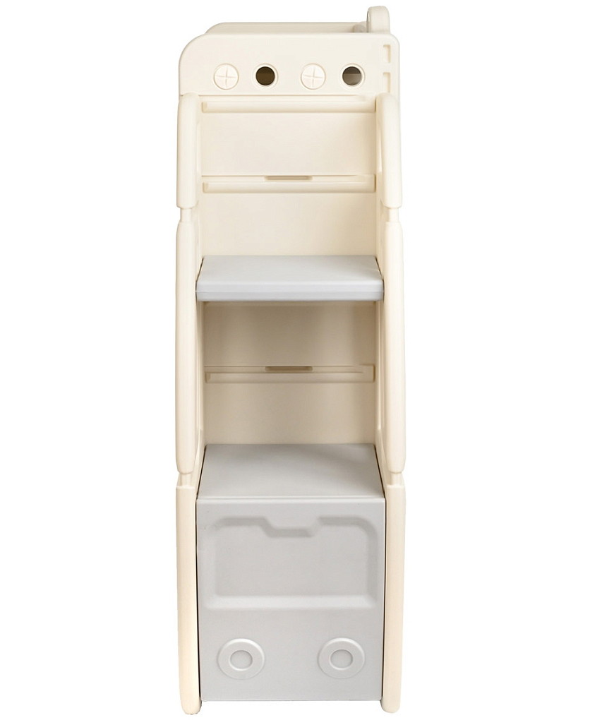 Стеллаж для игрушек с ящиками и полками выполнен из качественного пластика. Данный материал экологичен и прост в чистке. Небольшой вес стеллажа и его устойчивая конструкция обеспечивают ребёнку безопасность от ушибов.