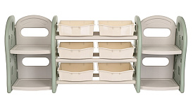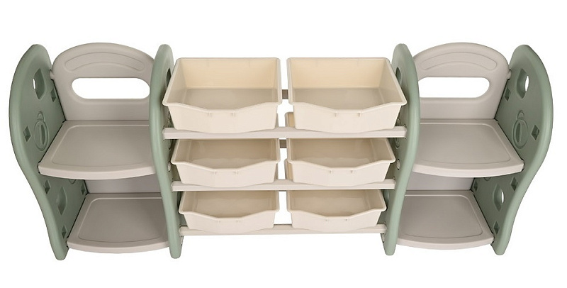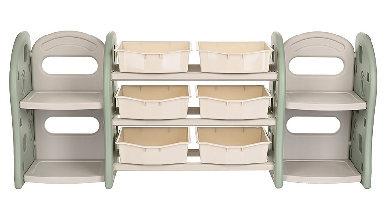 - Стеллаж для игрушек с ящиками и полками выполнен из качественного пластика. Данный материал экологичен и прост в чистке. Небольшой вес стеллажа и его устойчивая конструкция обеспечивают ребёнку безопасность от ушибов.