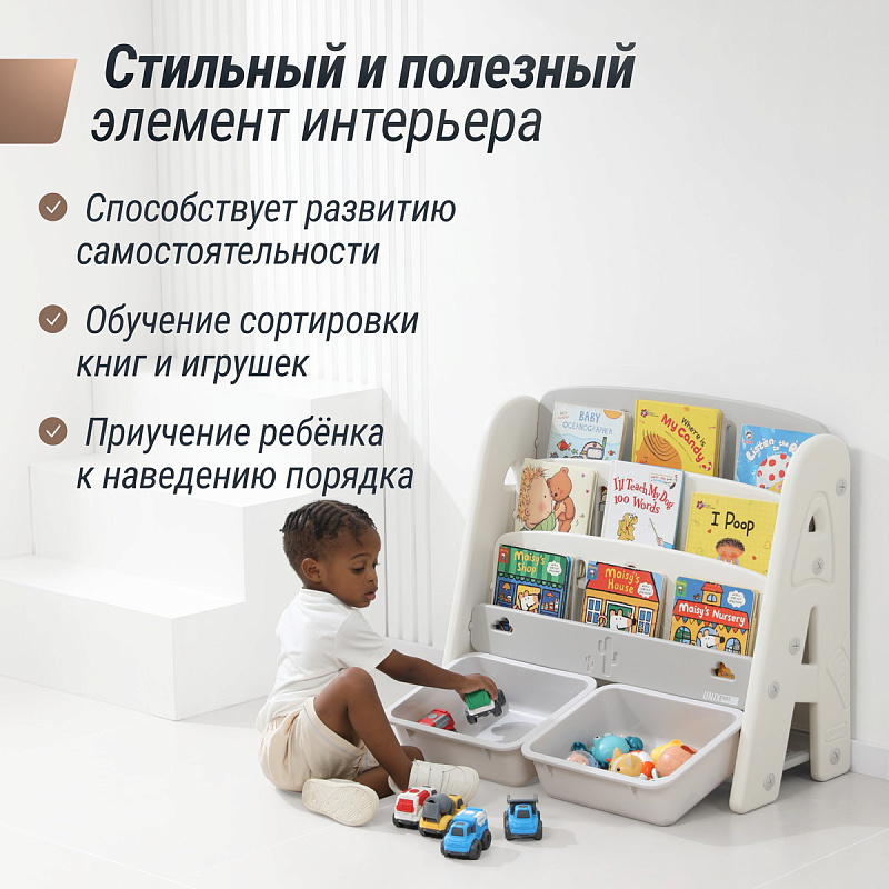 Организация пространства с помощью пластикового стеллажа способствует развитию ответственности у детей. Малыш будет постепенно привыкать к порядку и самостоятельно расставлять свои богатства! А также напольная конструкция позволит ребенку самому выбирать книжки для чтения перед сном!