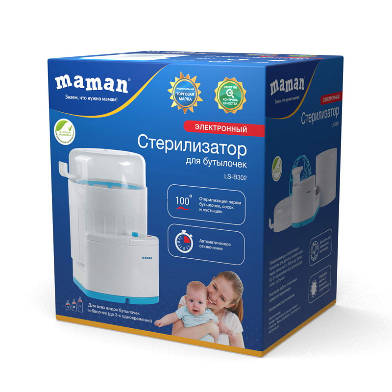 Модель отечественного бренда – электрический стерилизатор Maman LS-B302, который одновременно может стерилизовать до 3х бутылочек любого бренда емкостью от 100 до 300 мл.