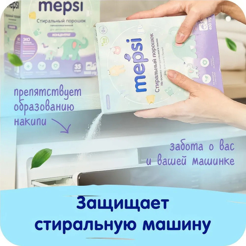 Детский стиральный порошок-концентрат без фосфатов, фосфонатов, парабенов и хлора Mepsi — это экологичное средство, созданное для стирки детской одежды с самого рождения.
