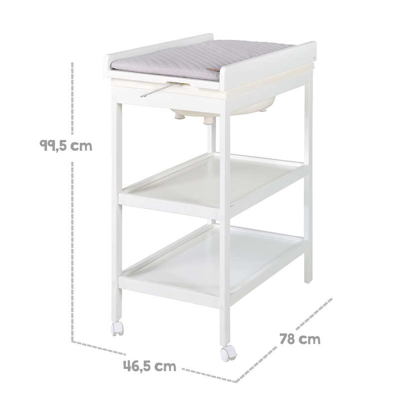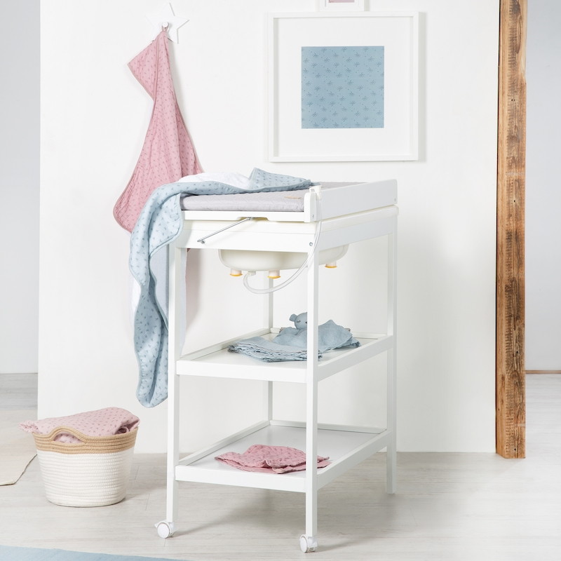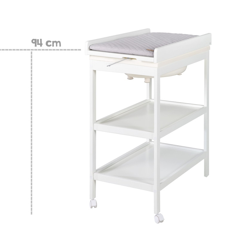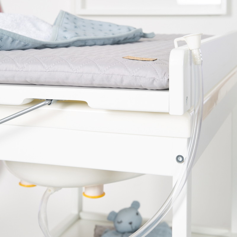 Встроенная ванна имеет сливной шланг и расположена под пеленальной поверхностью. Пеленальный столик можно превратить в место для купания ребенка одним движением руки.