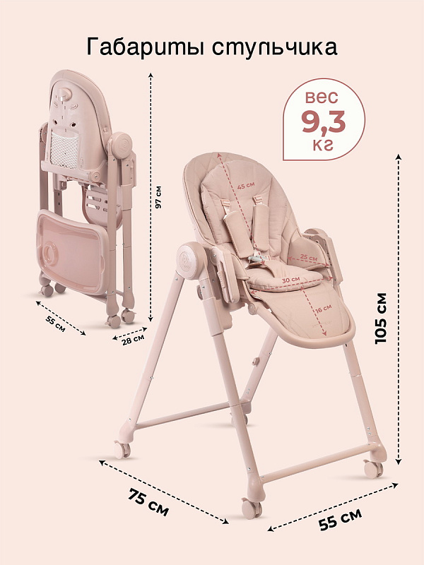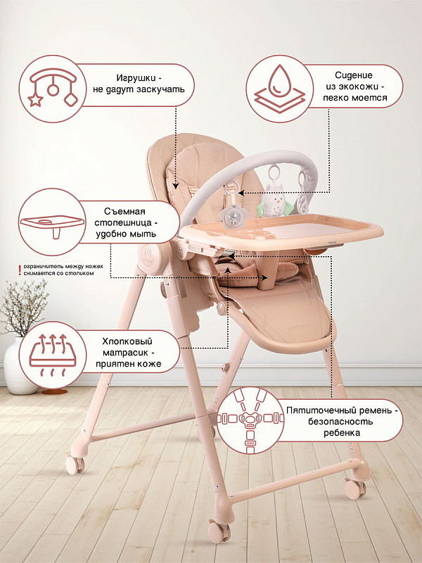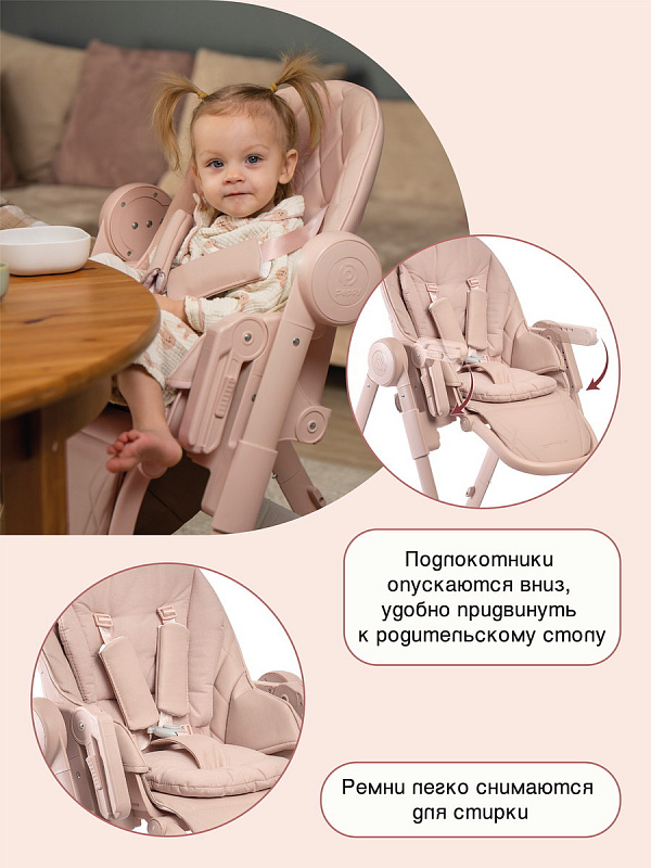 Безопасность для ребенка – стульчик оборудован пятиточечными ремнями с мягкими накладками. Ремни можно снять для очистки.