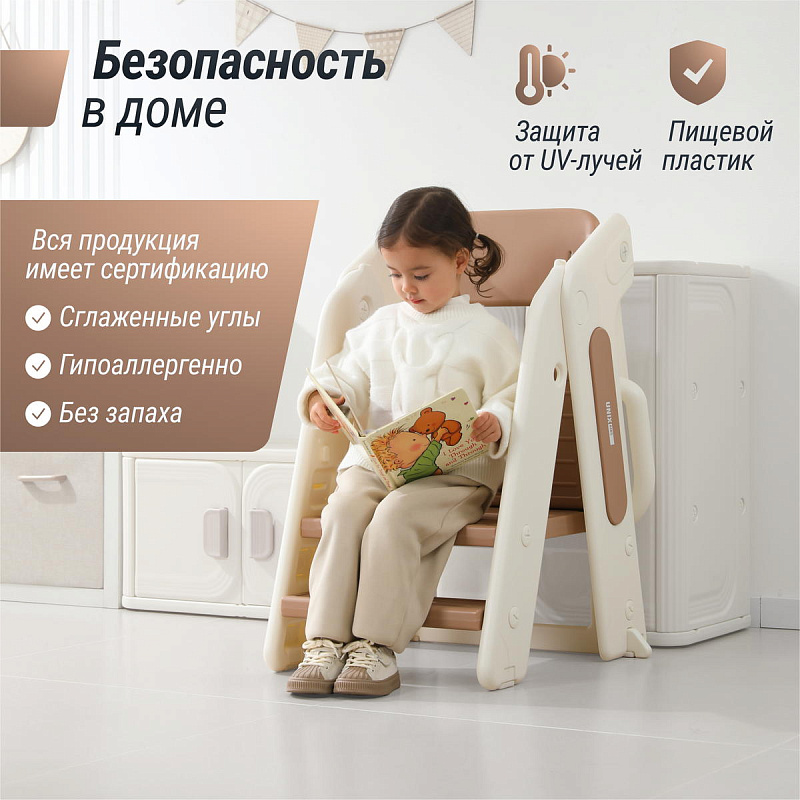 Вся продукция UNIX Kids имеет сертификацию и изготовлена из пищевого гипоаллергенного пластика, который не имеет запаха и абсолютно безопасен для детей. Он не подвержен UV-излучению, поэтому не выгорит на солнце и не потеряет свой цвет. Стульчик прекрасно моется, не боится воды и его легко поддерживается в чистоте.