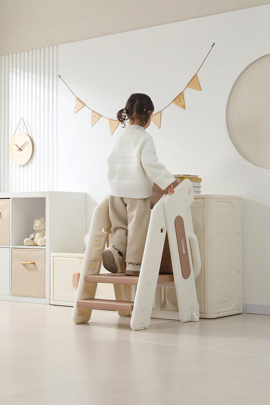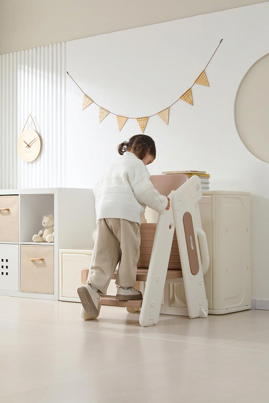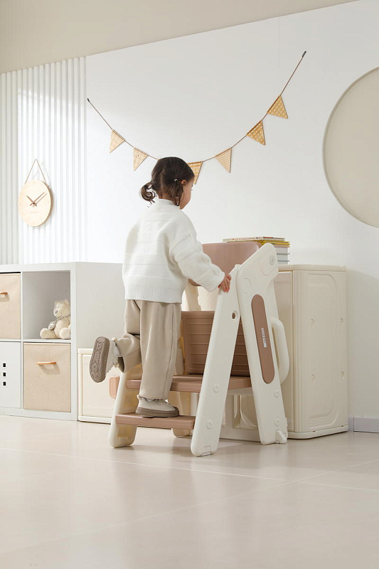 Третий уровень с 18 месяцев - стул-трансформер может с легкостью превратиться в лесенку или башню помощника. Малышу будет легко подниматься, чтобы положить или взять игрушки и книжки. Защитные перила и ограничительная спинка сделают подъем безопасным для маленьких пользователей. Лесенка очень устойчивая благодаря своей конструкции и противоскользящему покрытию ножек. Максимальная нагрузка до 50 кг.
