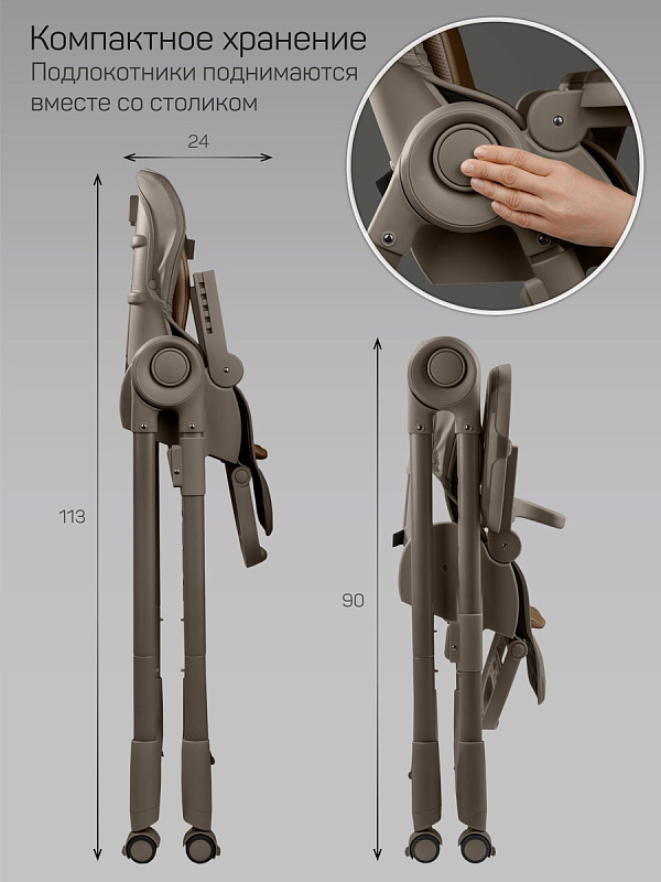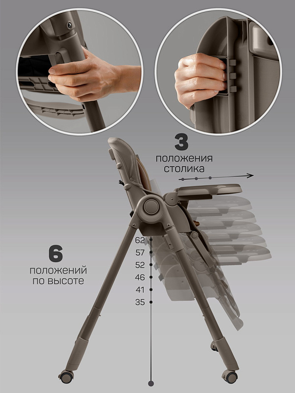 Легко передвигайте стульчик по комнате, не прилагая усилий, чтобы всегда быть рядом с малышом. Регулировка высоты позволит использовать детский стульчик за общим столом, а также адаптировать его под разные задачи.