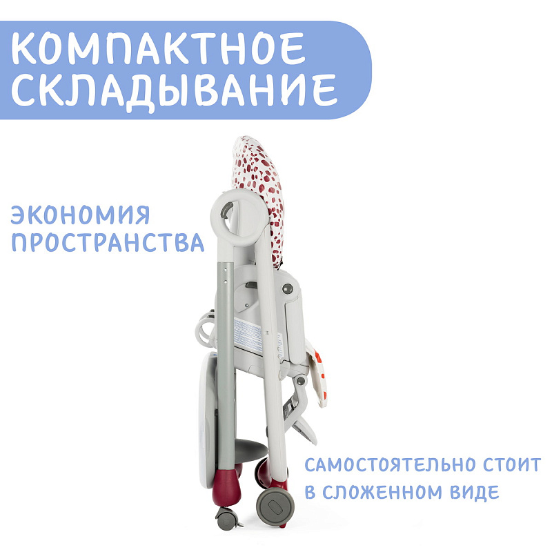 Все детали подгоняются по высоте, подстраиваясь под параметры малыша. В складном виде стул занимает немного места, а подвижные колесики позволяют перекатывать его вместе с ребенком.
