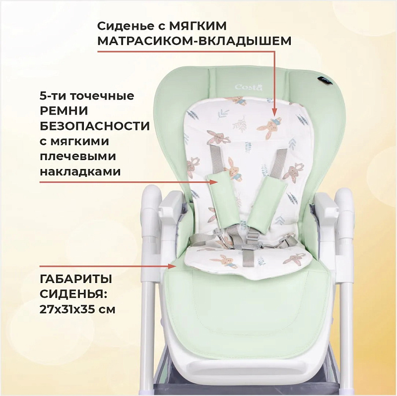 Детский стул для кормления Costa MIA для тех кто ценит удобство, функциональность и безопасность. Современный и практичный дизайн. Прочная конструкция и качественные материалы обеспечивают долгий срок эксплуатации и надежную защиту малыша во время еды.