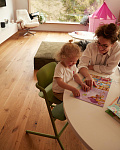 Стульчик легко трансформируется из высокого стульчика для кормления в низкий стульчик для приёма пищи, а также в удобное кресло для отдыха и игр. При этом не требуется никаких дополнительных инструментов.