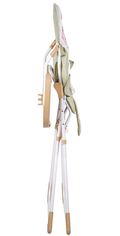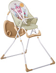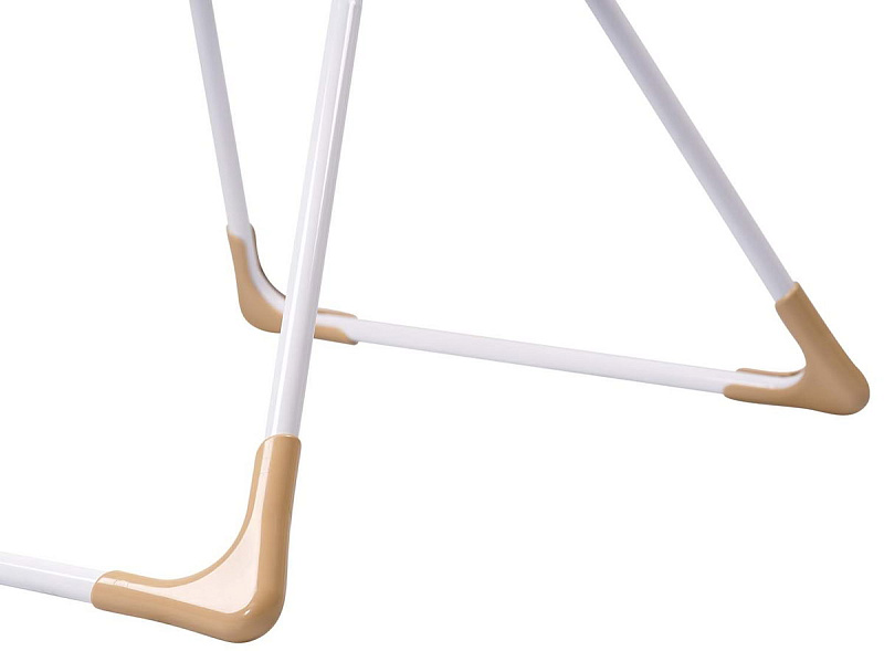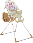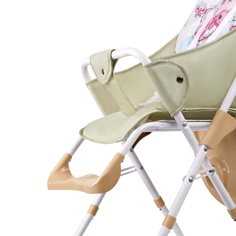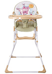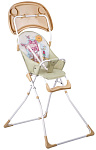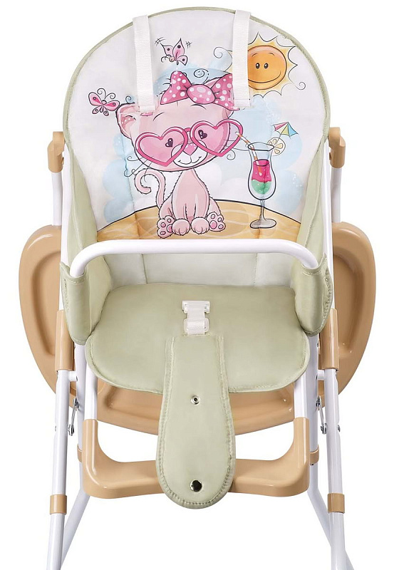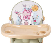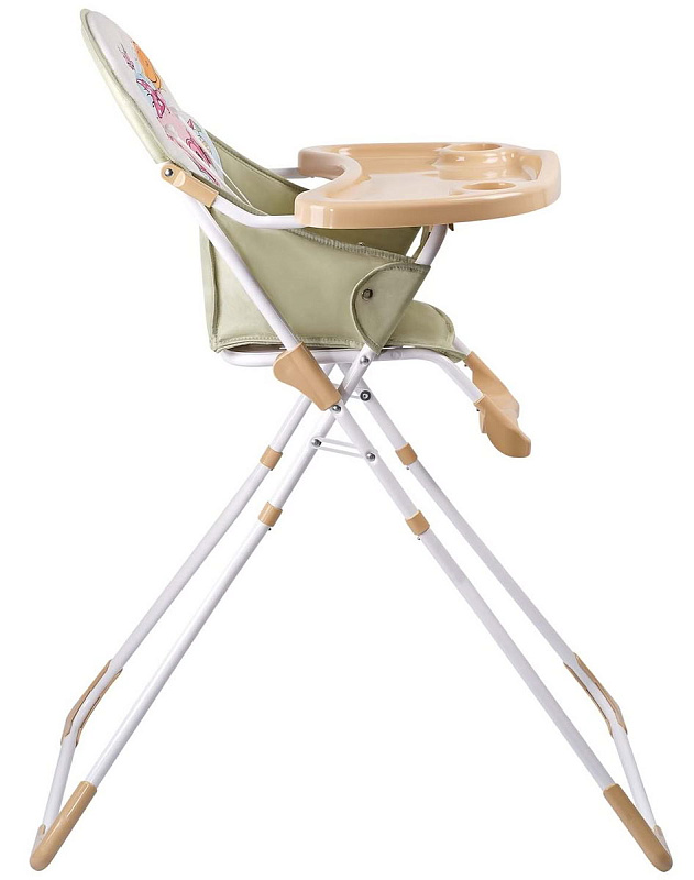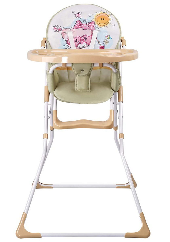 Мягкий чехол изготовлен из легко моющейся ткани — для уборки достаточно протереть его влажной тряпкой. Безопасность малыша обеспечивают тканевая перемычка между ножками и трёхточечный ремень. Внизу расположена удобная подножка для поддержки ног. Прочная столешница из пластика имеет бортики и специальные углубления для посуды, что облегчает кормление и защищает пол от случайно пролитых жидкостей. Столешница при необходимости снимается — ребёнка можно посадить за общий стол.