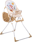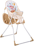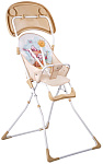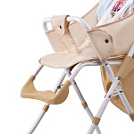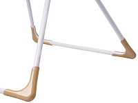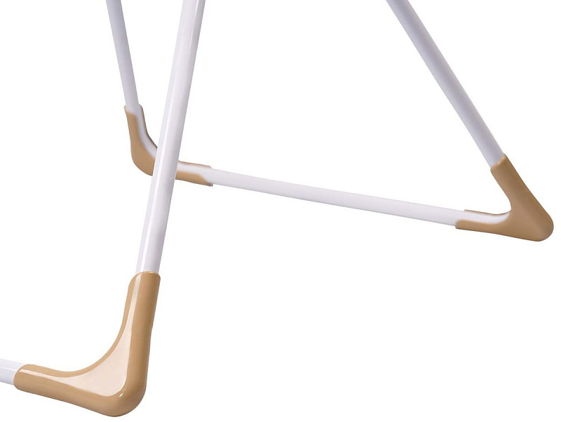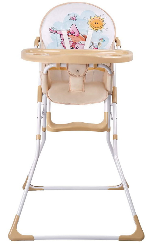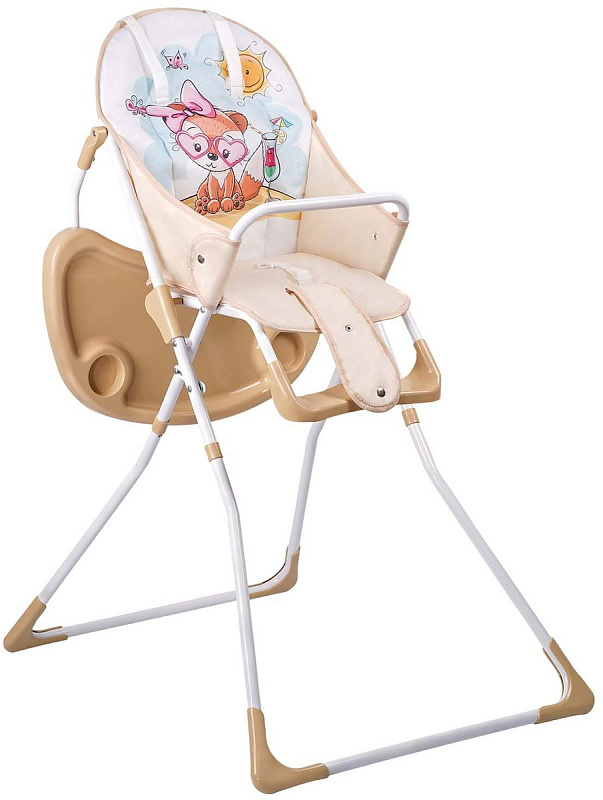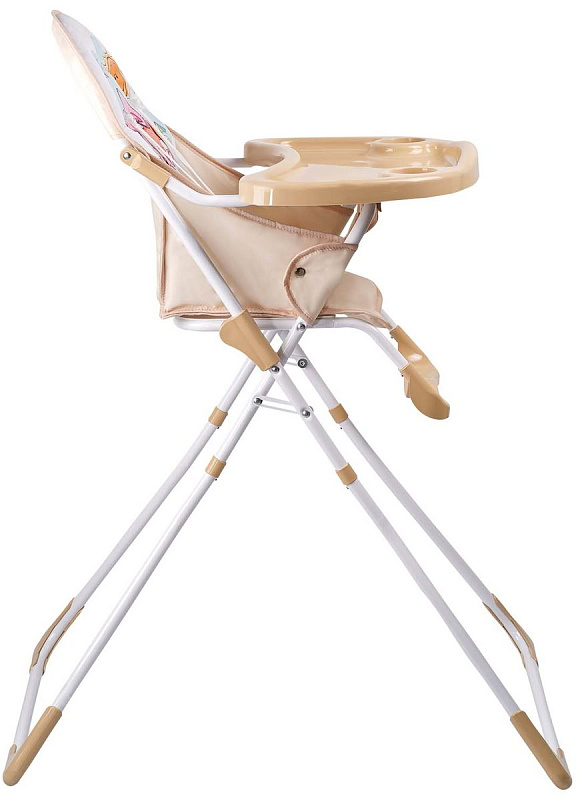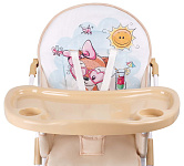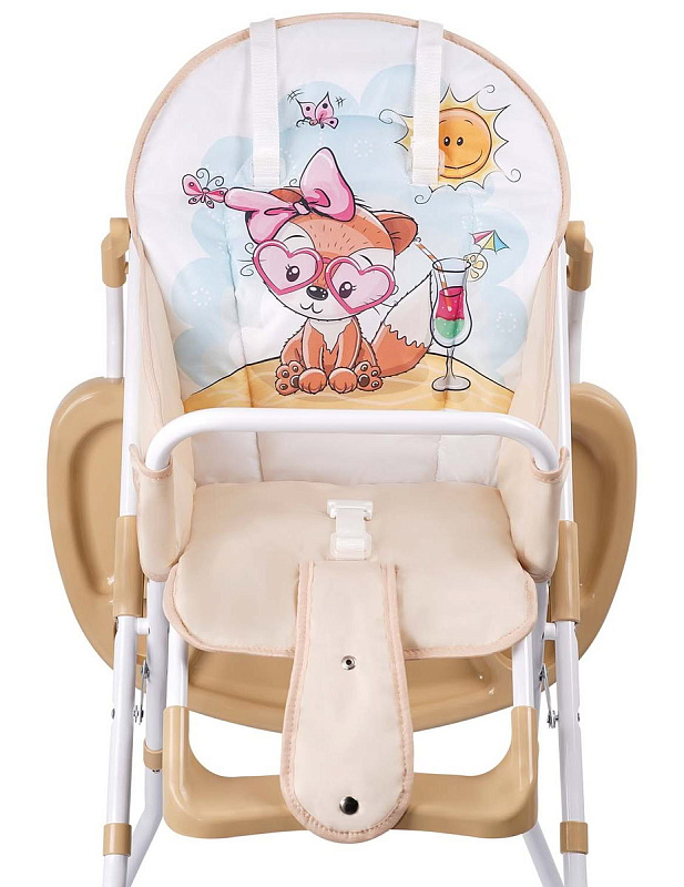 Мягкий чехол изготовлен из легко моющейся ткани — для уборки достаточно протереть его влажной тряпкой. Безопасность малыша обеспечивают тканевая перемычка между ножками и трёхточечный ремень. Внизу расположена удобная подножка для поддержки ног. Прочная столешница из пластика имеет бортики и специальные углубления для посуды, что облегчает кормление и защищает пол от случайно пролитых жидкостей. Столешница при необходимости снимается — ребёнка можно посадить за общий стол.