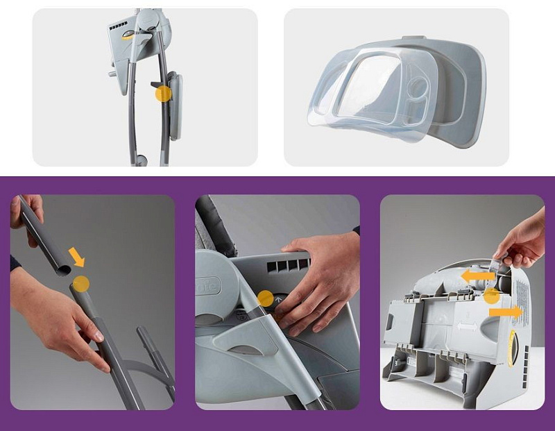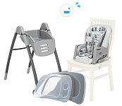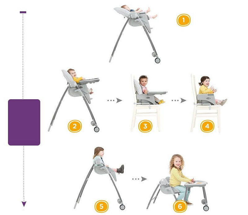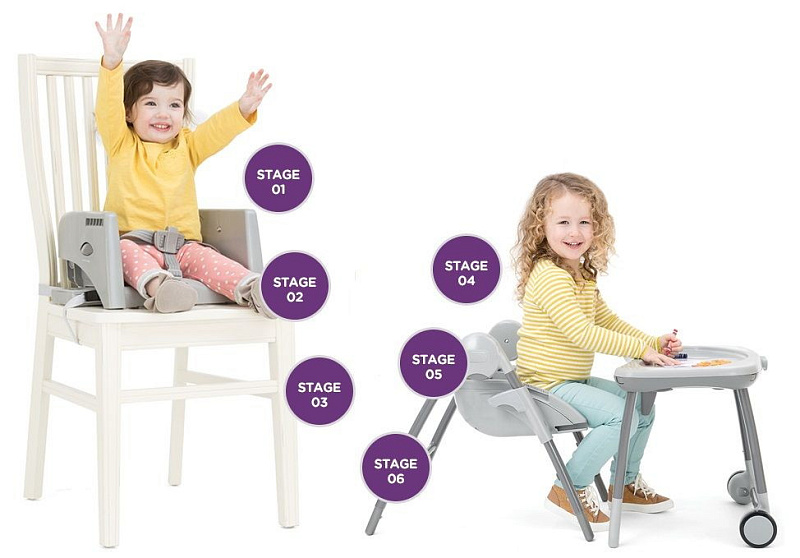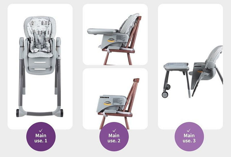 - 6 режимов использования (3 в режиме высокого стула, 2 в режиме стула (повышенный) и режим маленького ребенка с игровым столом)