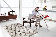 Стульчик легко чистить благодаря съемному столику с подносом, который можно мыть в посудомоечной машине. Обивка представлена в трех вариантах: экокожа, поливинилхлорид и инновационный материал Wonder, который отличается особой прочностью и легкостью в уходе. Стульчик компактно складывается книжкой и в сложенном виде устойчиво стоит без опоры, что облегчает его хранение.