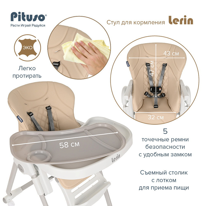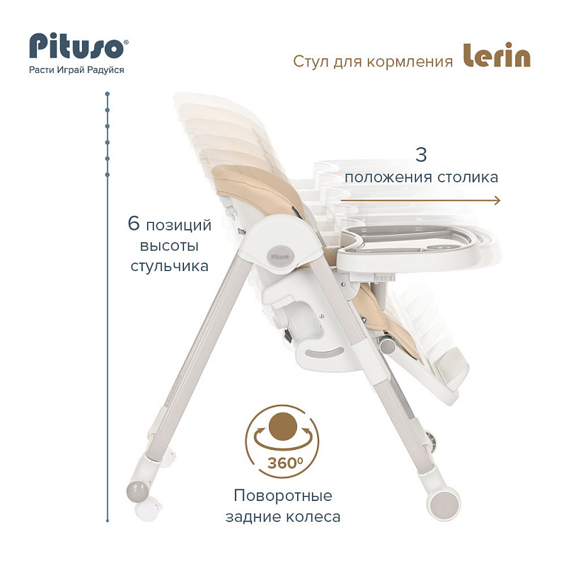 Стульчик Pituso LERIN - функциональный и удобный стульчик для кормления. Алюминиевая рама создает устойчивость и надежность, а задние колесики оснащены педалью тормоза. Безопасная конструкция с мягким сидением легко чистится и компактно складывается. Съемный столик подгоняется в наилучшее положение для кормления, а лоток для приема пищи легко моется. Высоту стульчика Pituso LERIN можно настроить в 6 положениях. Пятиточечные страховочные ремни безопасности позволят весело проводить время с малышом, не опасаясь, что он вывалится наружу. Свободно регулируемый угол наклона спинки и 3-х ступенчатая регулировка подножки позволит ребенку сладко вздремнуть после приема пищи. Современная эргономичная форма прекрасно впишется в любой интерьер.