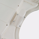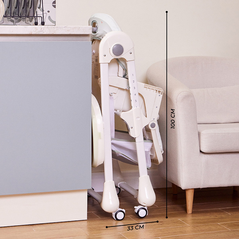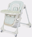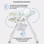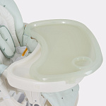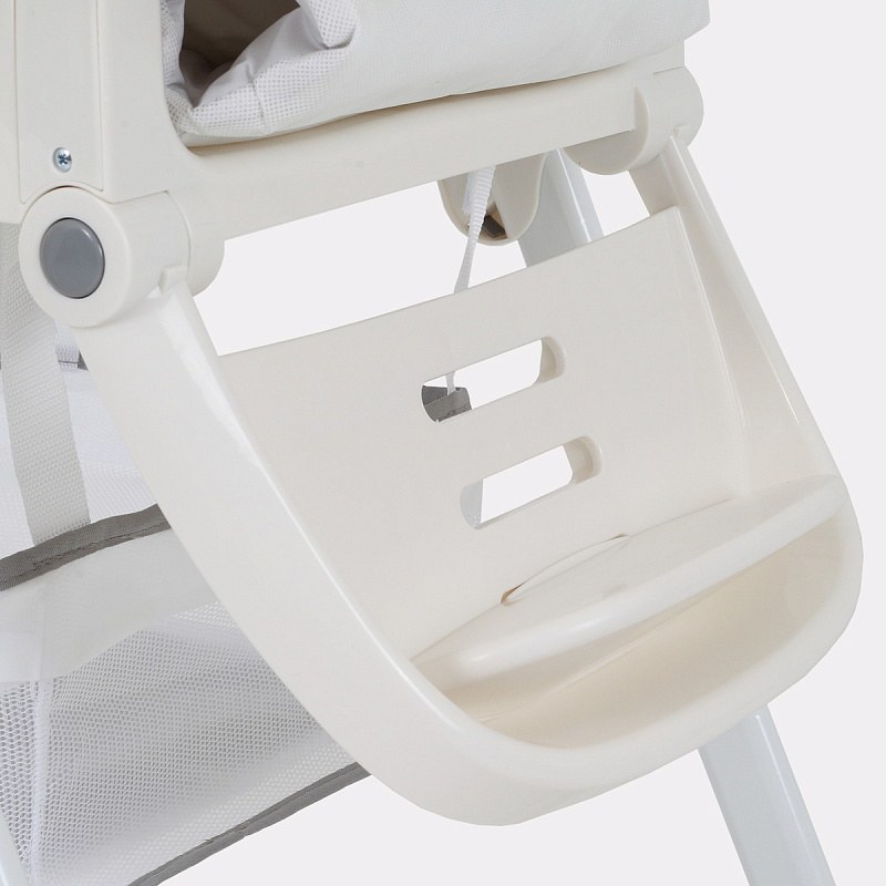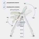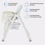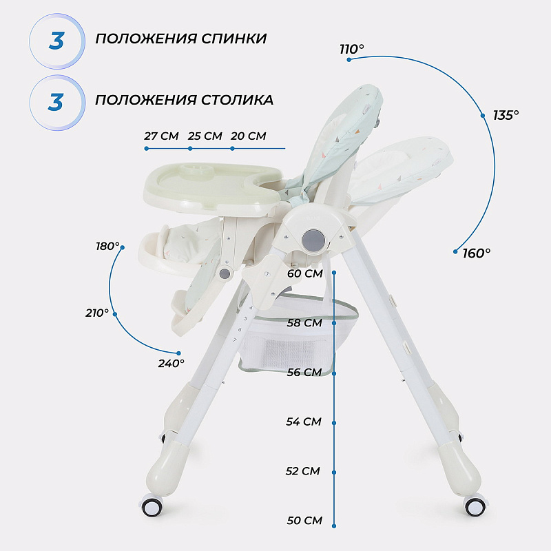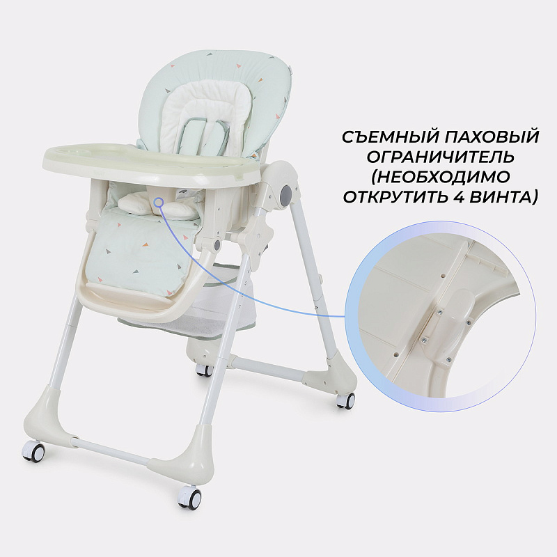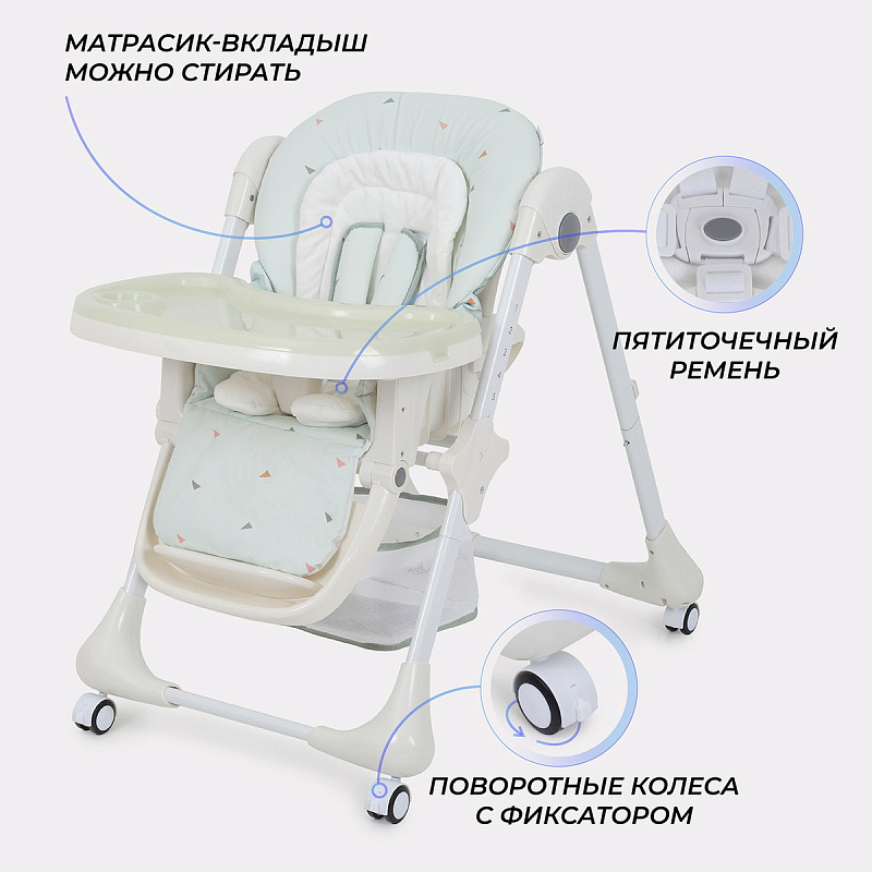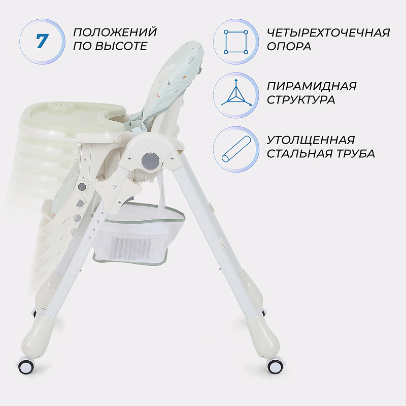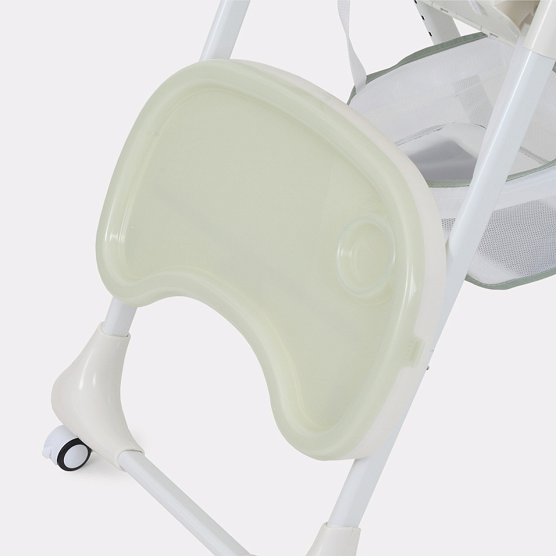 Стульчик для кормления выполнен из качественных материалов, конструкция не имеет острых углов. Сидение произведено из водоотталкивающих материалов, что облегчает уборку после еды. Двойная столешница съёмная, регулируется по высоте. Разделитель для ножек предотвратит соскальзывание ребенка.