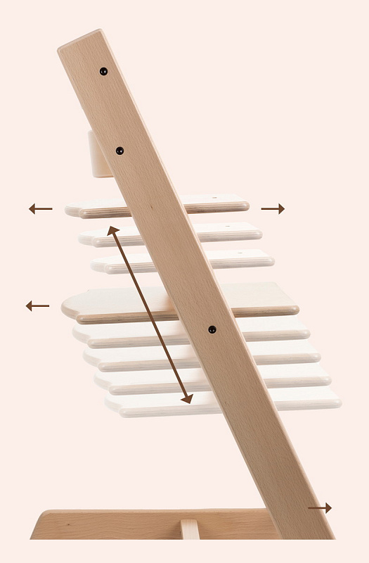Стул Tripp Trapp® растёт вместе с вашим ребёнком. Продуманная, регулируемая конструкция обеспечивает свободу движений благодаря регулировке глубины и высоты сиденья и подножек. Это означает, что при правильной регулировке вашему ребёнку будет обеспечено удобное и эргономичное положение в любом возрасте.