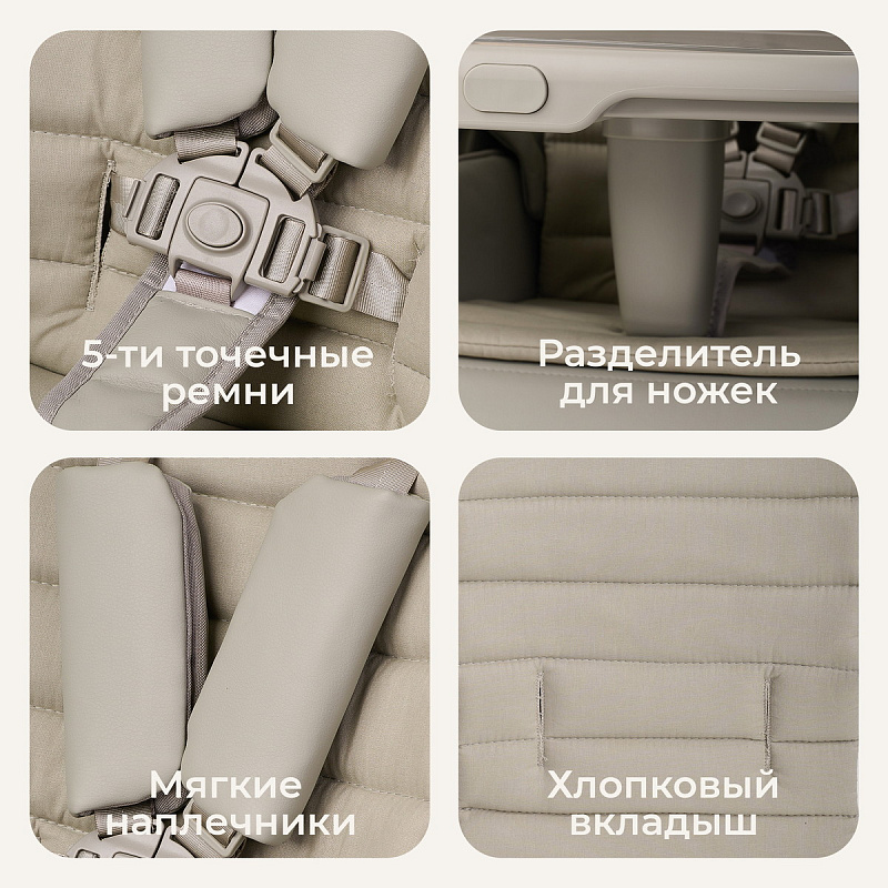 3. Продуманные детали: мягкие наплечники, регулируемый по глубине съемный столик и удобный разделитель для ножек — каждая мелочь заботится о правильном положении и настроении ребенка.