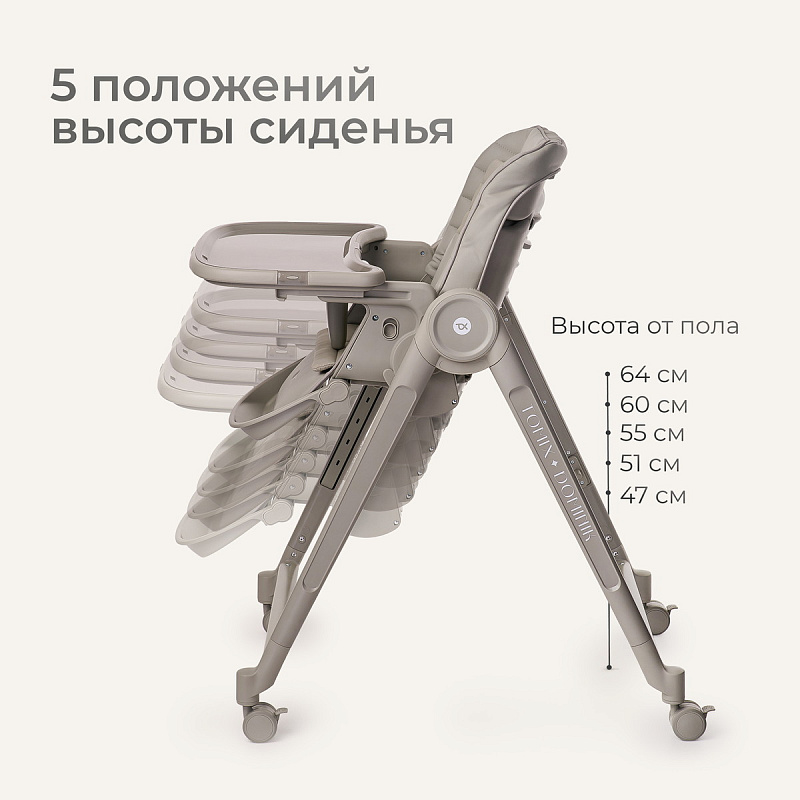 1. Индивидуальные настройки: 5 уровней высоты сиденья, 3 положения спинки (вплоть до режима «шезлонг»), регулируемая высота самой спинки и 3 положения подножки. Вы создадите идеальную позу для кормления, игр или отдыха.