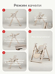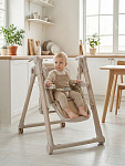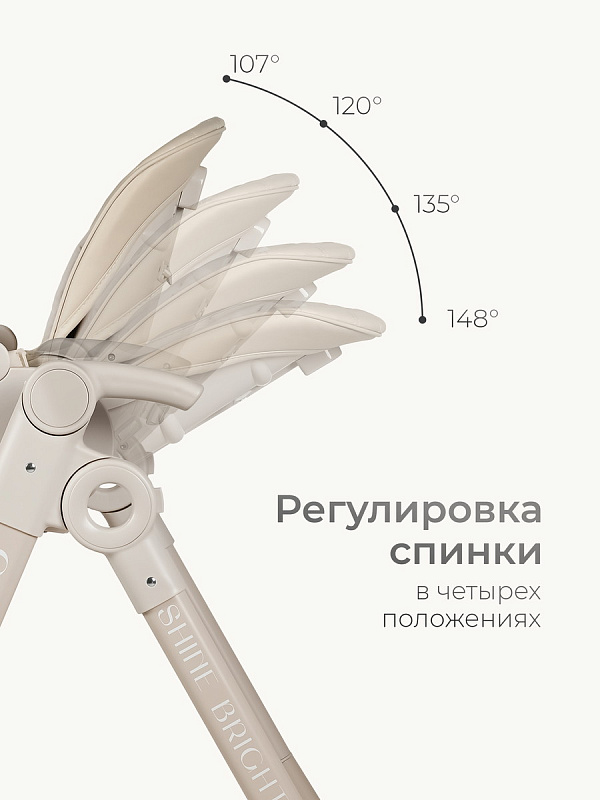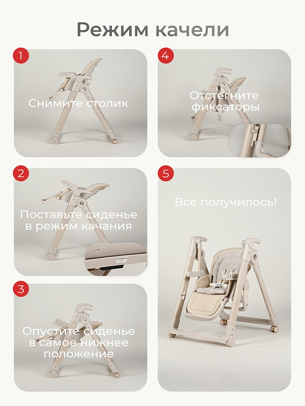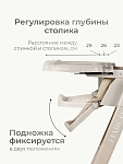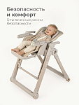 Мягкая подкладка на сиденье и спинке создаёт дополнительный уют, а пятиточечные ремни безопасности удерживают малыша в комфортном и безопасном положении. Стул регулируется по высоте в пяти уровнях, что позволяет легко адаптировать его к различным столам. Спинка и подножка имеют по три положения, обеспечивая оптимальное положение для кормления, отдыха или лёгкого укачивания.