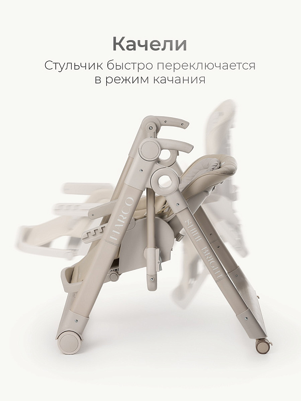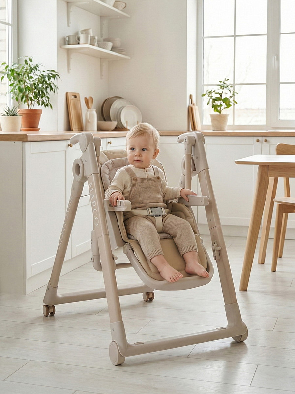 Стул для кормления-шезлонг Tomix Marco сочетает комфорт, безопасность и функциональность для ежедневного ухода за малышом. Модель оснащена механической функцией качания, позволяющей плавно укачивать ребенка без лишних усилий. Задние поворотные колёса с тормозным механизмом обеспечивают удобное перемещение стула и надежную фиксацию на месте.