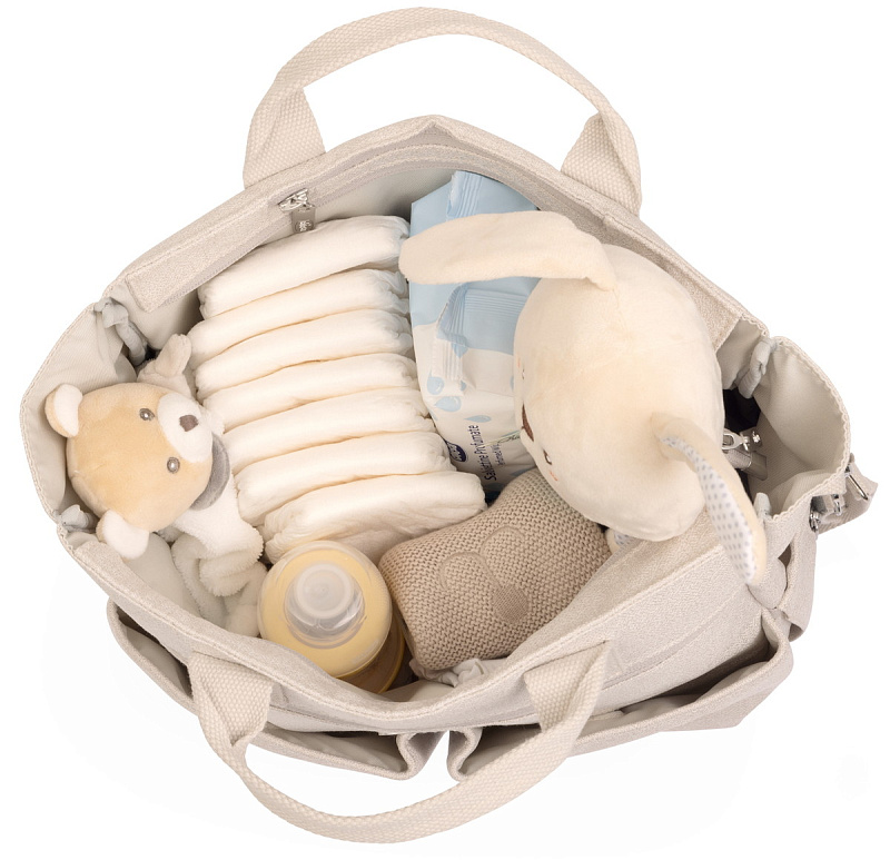 Сумка оборудована 11 карманами, в которых можно хранить ключи, телефон, детские бутылочки и игрушки. Это позволяет всегда иметь под рукой необходимые предметы. Съемный ремешок через плечо с карабином, позволит носить аксессуар в руках или на плече. Крепления на липучках подойдут на любые ручки колясок даже самые толстые