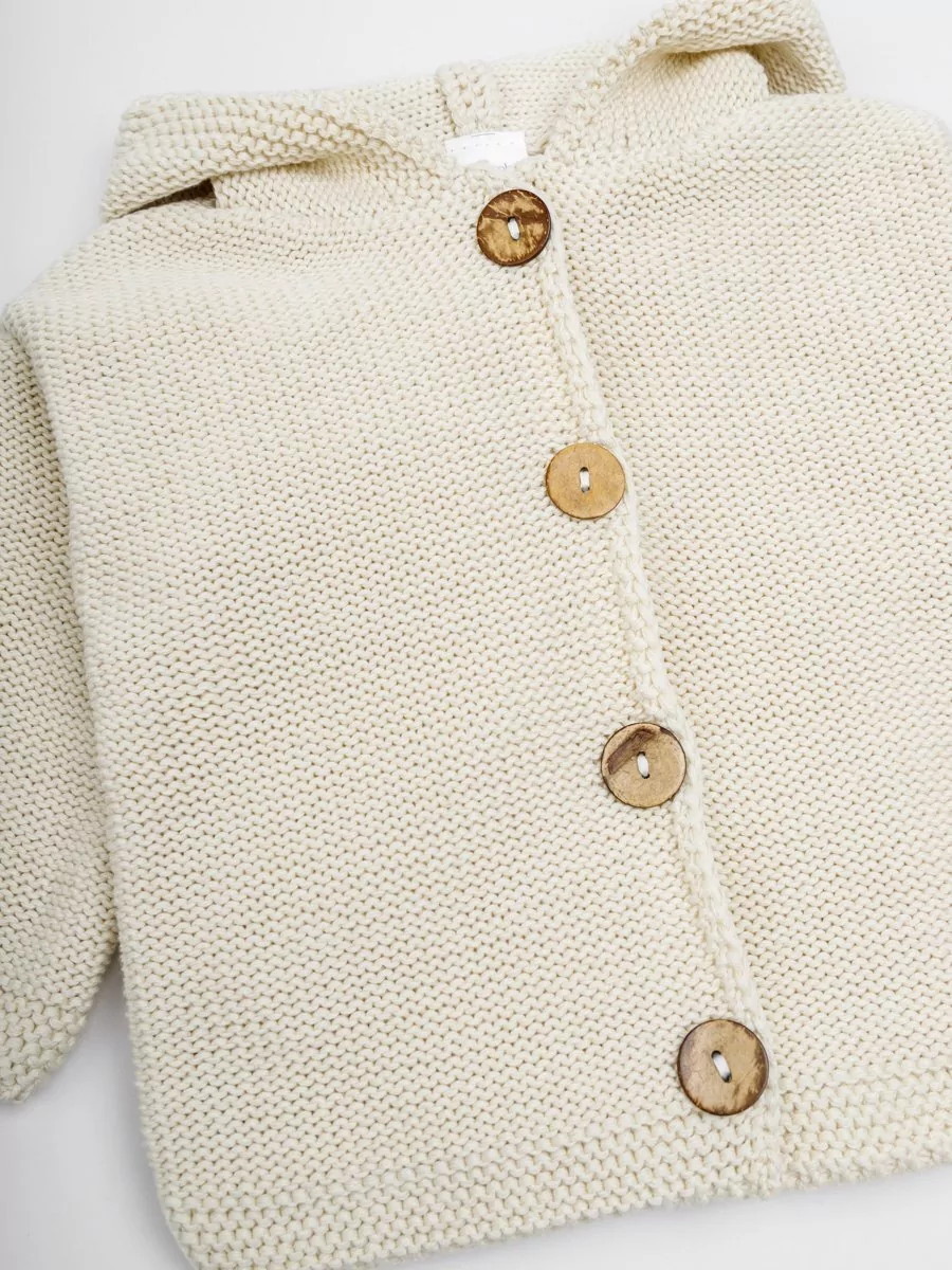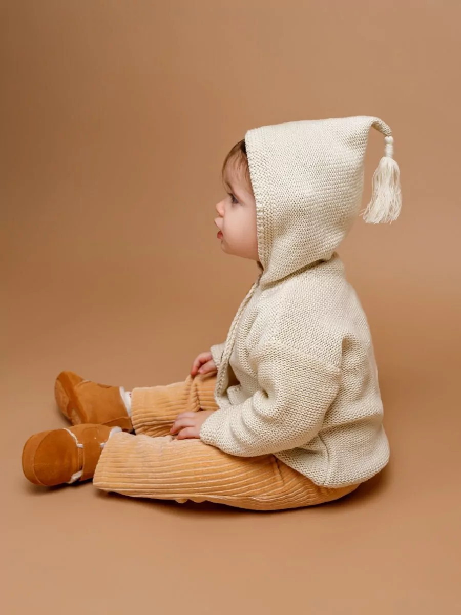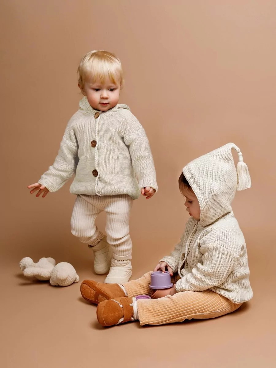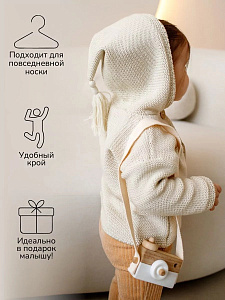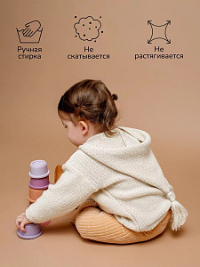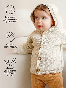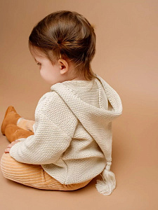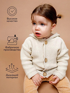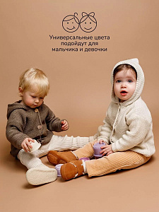 придающей ему невероятную уютную фактуру. За счет универсальных цветов джемпер на пуговицах подойдет, как для мальчика, так и для девочки, а интересная кисточка на капюшоне придадаст милый вид ребенку.