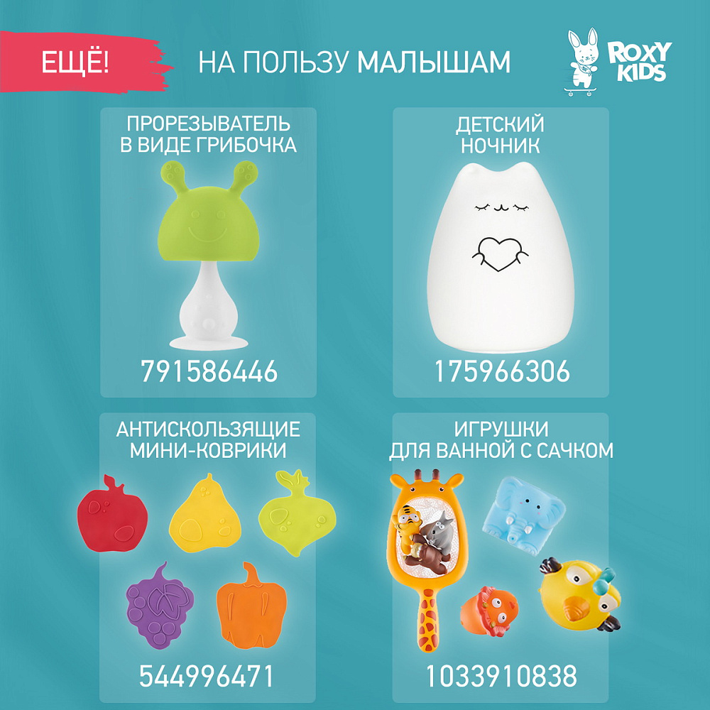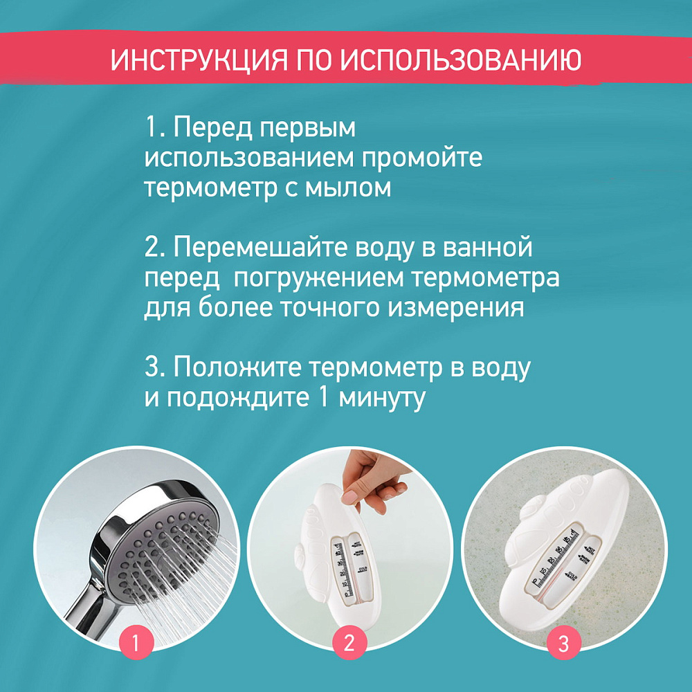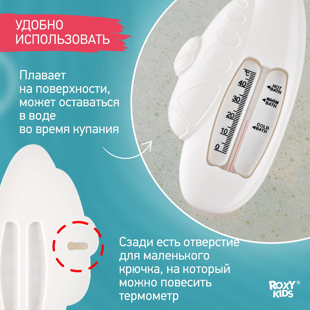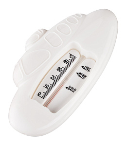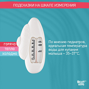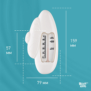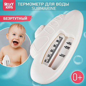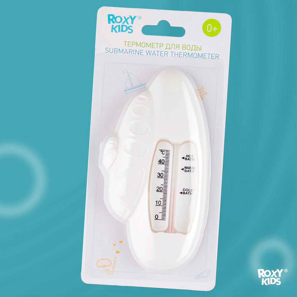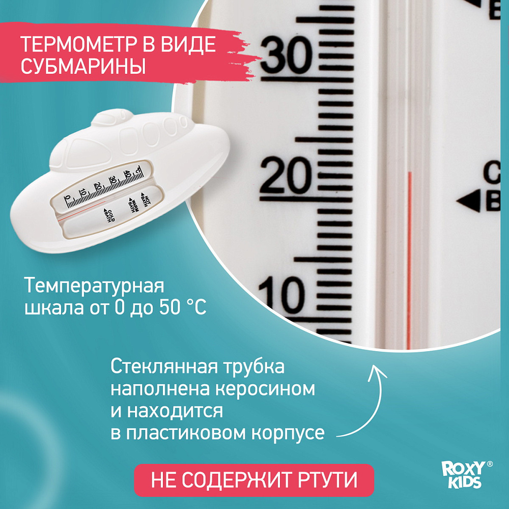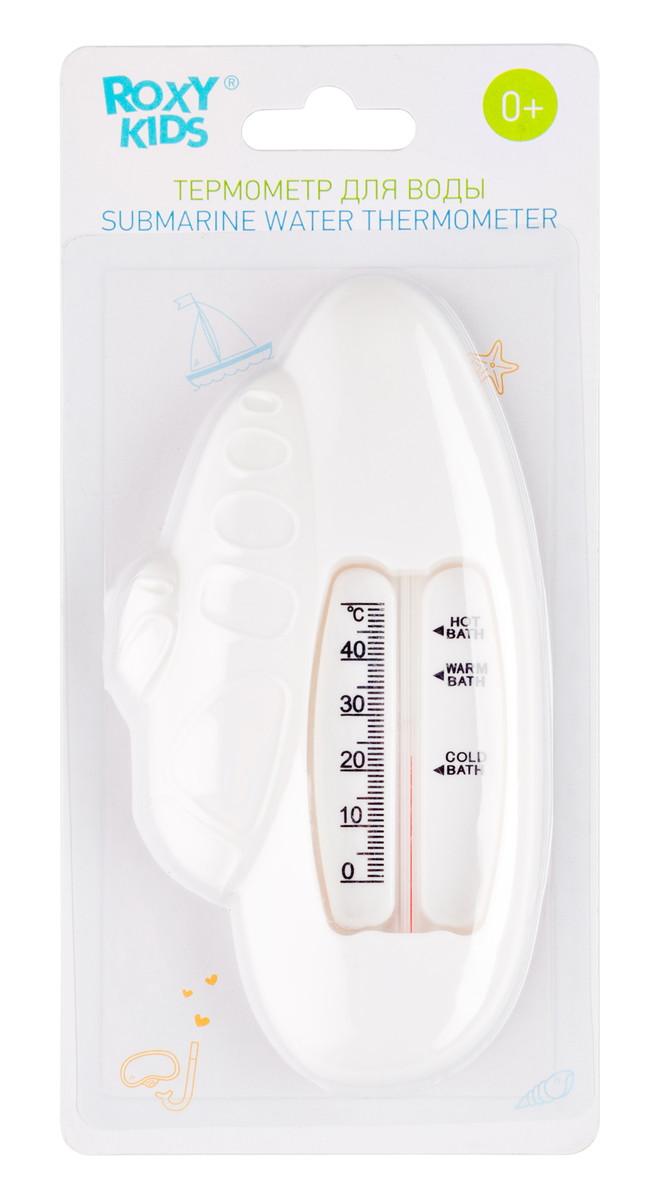 Этот термометр точно измеряет температуру воды для купания детей в ванной. Изделие плавает на поверхности и может оставаться в воде во время всего купания, так как не содержит ртути. Стеклянная шкала наполнена керосином и находится в пластиковом корпусе. Для измерения температуры воды нужно подержать термометр в ванной 1-2 минуты. Он имеет четкую шкалу до 50 градусов Цельсия. В ассортименте ROXY-KIDS есть несколько видов термометров.