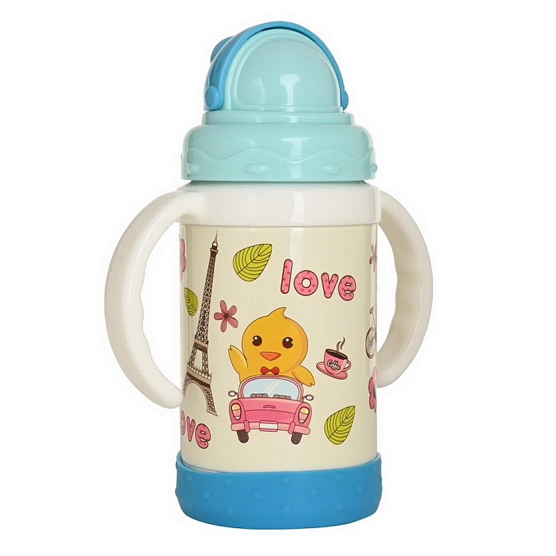 Детский термо-поильник 280 мл с силиконовой трубочкой. Корпус детской термокружки с ручкой изготовлен из высокопрочного пластика, колба из высококачественной пищевой нержавеющей стали.