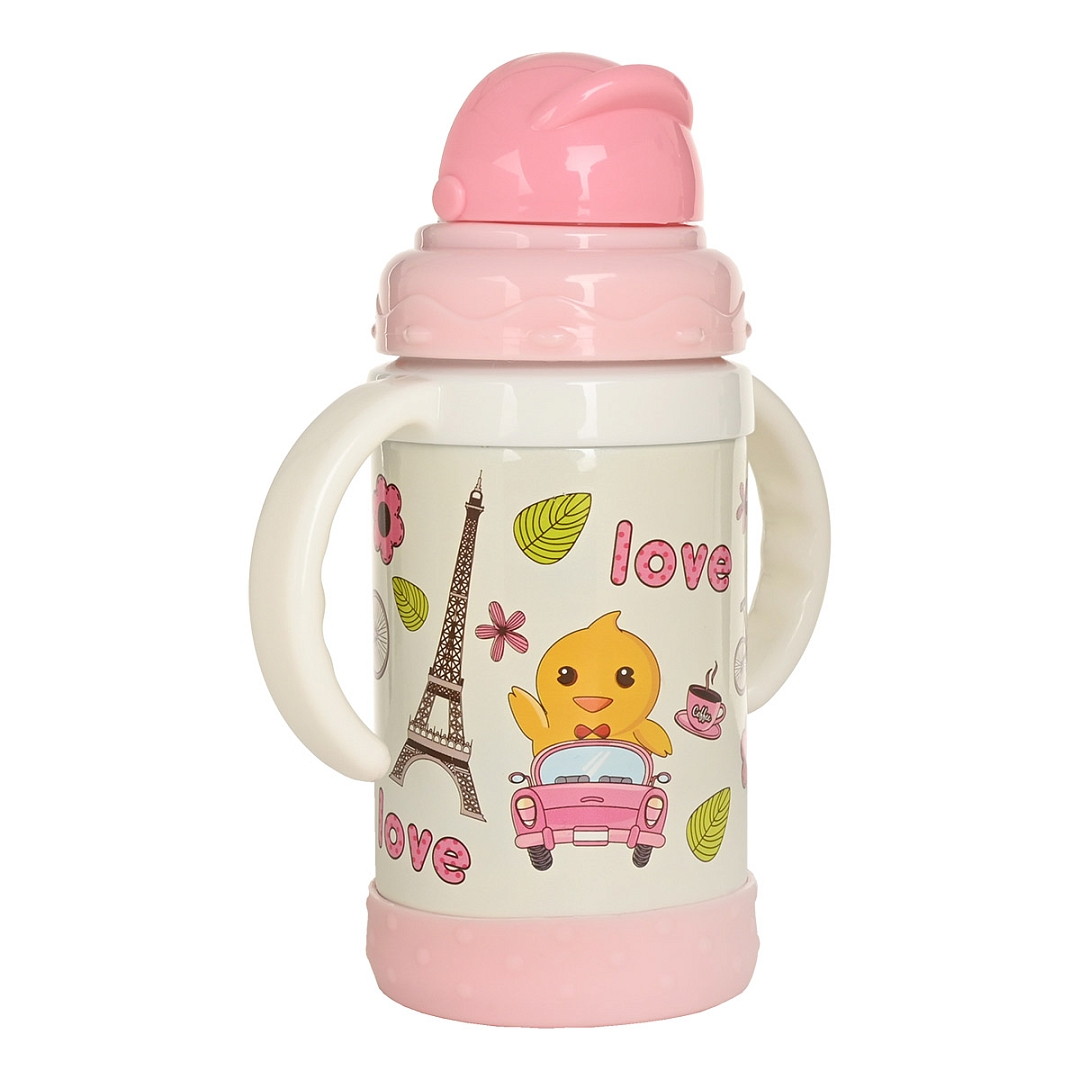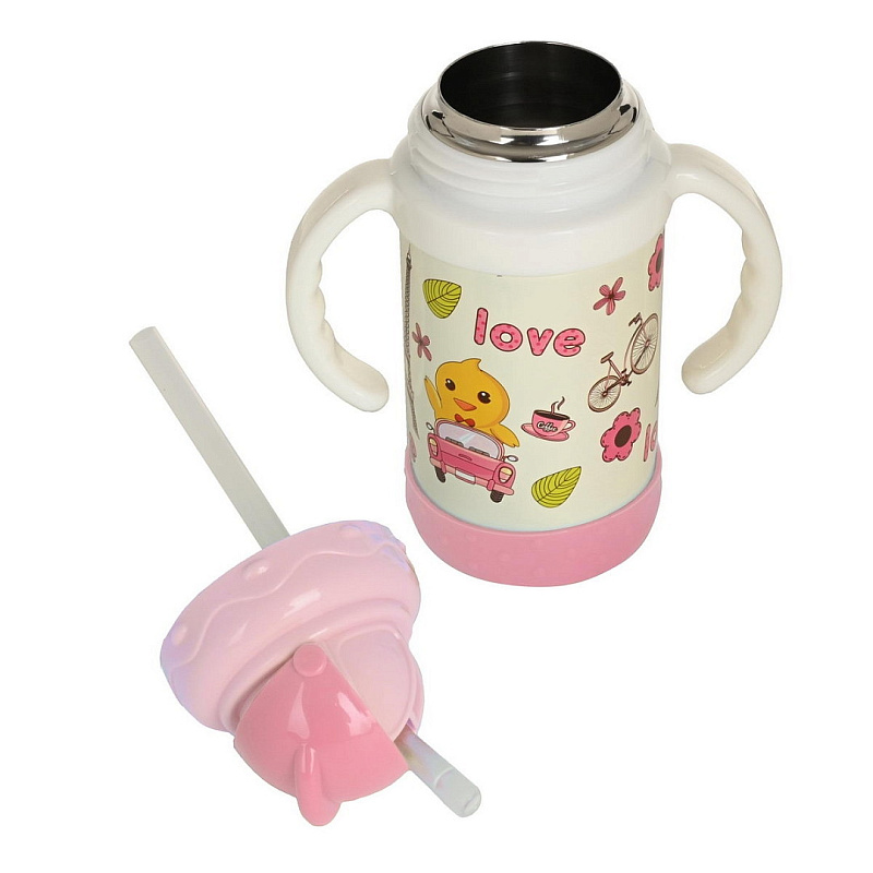 Детский термо-поильник 280 мл с силиконовой трубочкой. Корпус детской термокружки с ручкой изготовлен из высокопрочного пластика, колба из высококачественной пищевой нержавеющей стали.