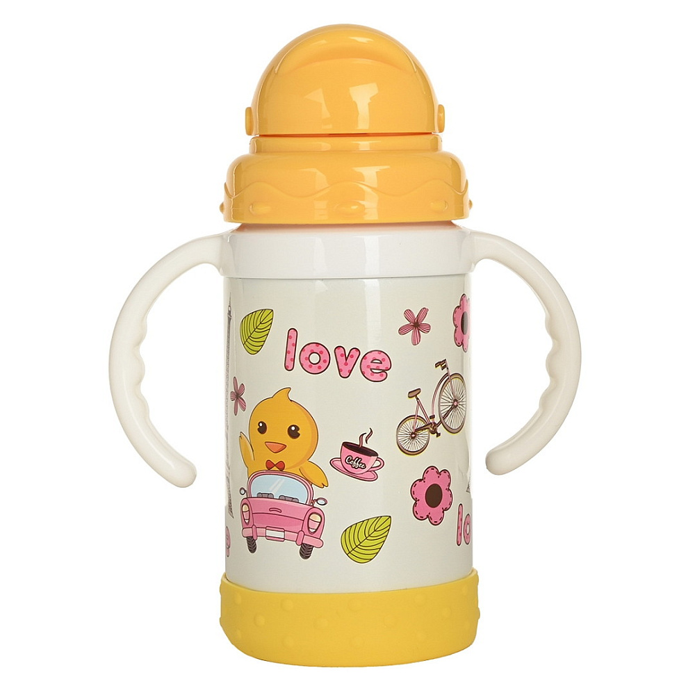 Детский термо-поильник 280 мл с силиконовой трубочкой. Корпус детской термокружки с ручкой изготовлен из высокопрочного пластика, колба из высококачественной пищевой нержавеющей стали.