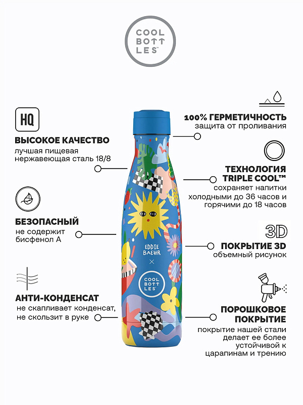 Термос-термобутылка Cool Bottles™ разработан с учётом ваших вкусов и образа жизни. Его можно брать с собой в офис, университет, спортзал, горы, на пляж, в парк... куда угодно!
