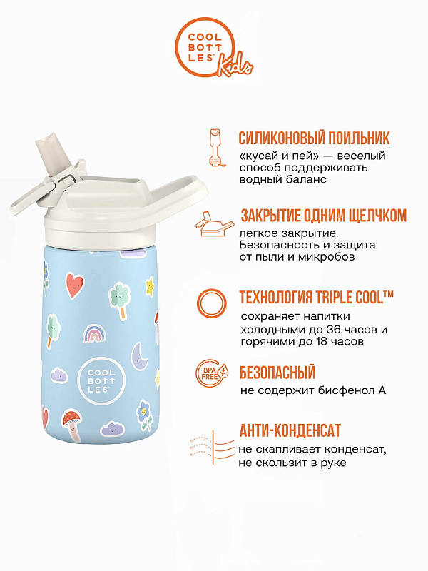 Рекомендуется малышам от 12 месяцев. Из термоса с поильником не только удобно пить воду и любимые напитки, но и быстро перейти от бутылочки с соской к использованию трубочки и обычной чашки. Cool Bottles Kiddie— это оптимальное сочетание дизайна, безопасности и функциональности для стильного поддержания водного баланса детей.