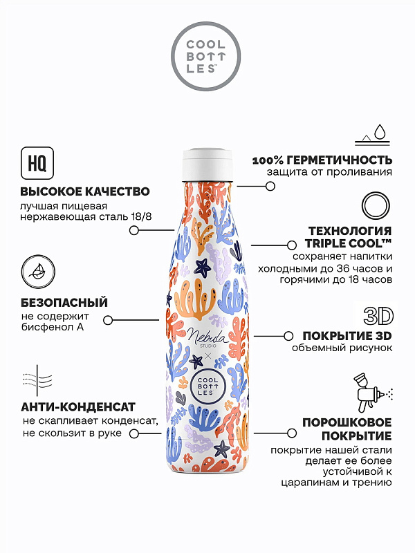 Термос-термобутылка Cool Bottles™ разработан с учётом ваших вкусов и образа жизни. Его можно брать с собой в офис, университет, спортзал, горы, на пляж, в парк... куда угодно!