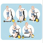 Детский самокат изготовлен из качественных материалов. Сочетает в себе функции беговела и велосипеда с функцией трансформации из трехколесных в двухколесные. Педали съемные, хранятся в пазах сидения.