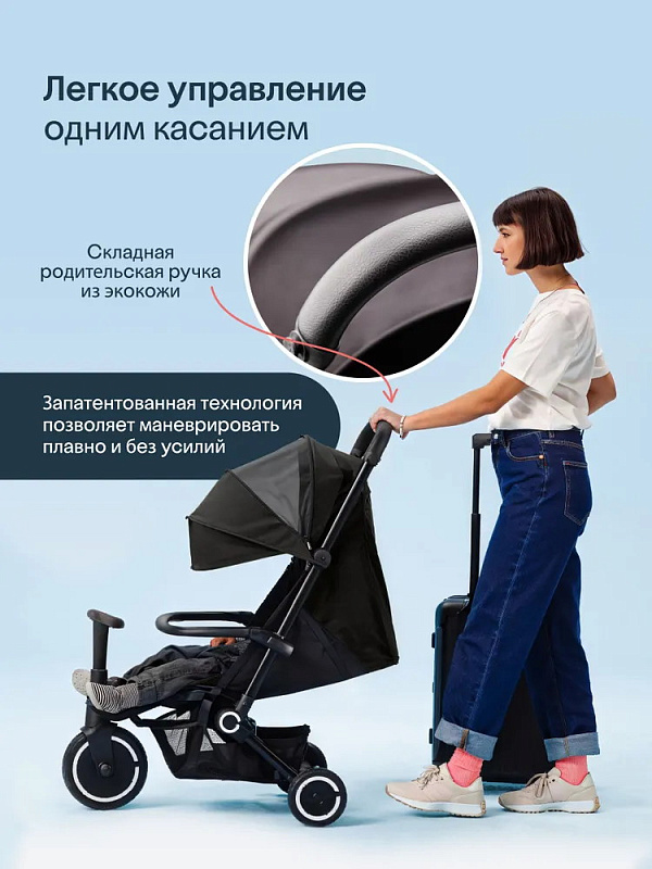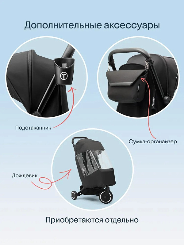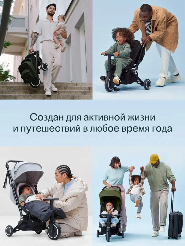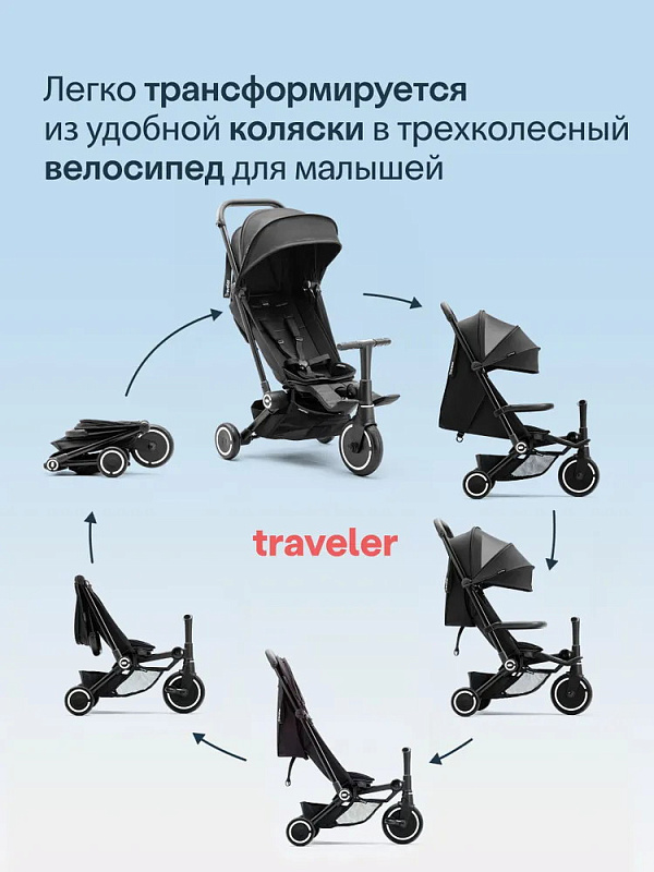 Traveler сочетает в себе все функции обычной прогулочной коляски и особенности трехколесного велосипеда. А когда приходит время возвращаться домой, механизм быстрого складывания делает хранение Traveler простым и удобным.