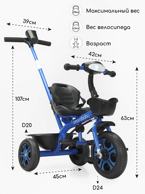 Велосипед трехколесный детский AmaroBaby Legend - легкий и устойчивый трехколесный велосипед для первых поездок малыша, предназначен для детей от 1 года и выдерживает нагрузку до 25 кг. Он не только доставит удовольствие от катания, но и научит ребенка держать равновесие и тренировать координацию. Велосипед подходит как для девочек, так и для мальчиков. Багажник и передняя корзина входят в комплект детского велосипеда, поэтому ребенок и родители могут взять с собой на прогулку игрушки и другие аксессуары. Трехколесный велосипед с ручкой - безопасный, комфортный, красивый и многофункциональный детский транспорт как для малышей, так и для родителей. Велосипед для прогулок имеет эргономичное сиденье с ремнем безопасности, и регулировкой ближе или дальше от руля. Удобные складные подножки велосипеда, не мешают движению, когда малыш крутит педали. У велосипеда нескользящие ручки с ограничителями для удобства и безопасности ребенка. Детский велосипед оснащен музыкой и световой панелью, что сделает прогулку вашего малыша более интересной и веселой. Велосипед для детей весит всего 4,9 кг и легко управляется взрослым с помощью комфортной ручки с подстаканником, которую можно регулировать по высоте. Легкие бесшумные колеса из материала EVA не прокалываются и не требуют подкачки, легко очищаются от загрязнений. Диаметр переднего колеса 24 см, задних колес 20 см. Велосипед для мальчика и девочки разработан для детей дошкольного возраста и легко может служить альтернативой прогулочной коляски.