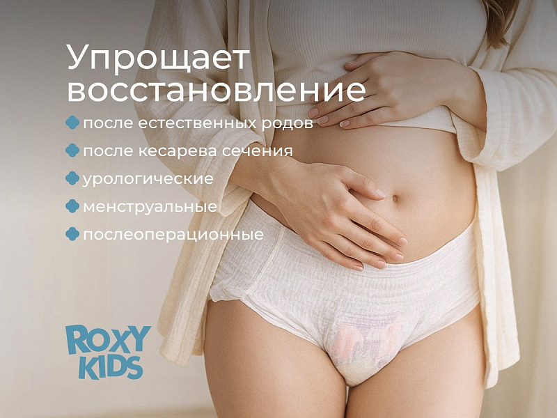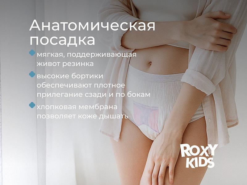 Гигиенические трусы ROXY-KIDS сочетают свойства одноразовых трусов для роддома и послеродовых прокладок. Изделие адаптируется под фигуру и остается незаметным под одеждой. Трусы легко надеваются и имеют утягивающий эффект. Хлопковая текстура позволит коже дышать, а тонкая ткань и мягкие швы будут ощущаться как хлопковое нижнее белье. Дизайн трусов повторяет анатомические особенности тела. Высокие бортики обеспечат защиту от протекания со всех сторон. Гигиеническая прокладка длиной 36 см впитывает до 400 мл влаги. Впитывающий слой из суперабсорбента и целлюлозной ваты моментально превращается в гель: это позволяет надежно удержать жидкость внутри прокладки и сохранить сухость и комфорт.