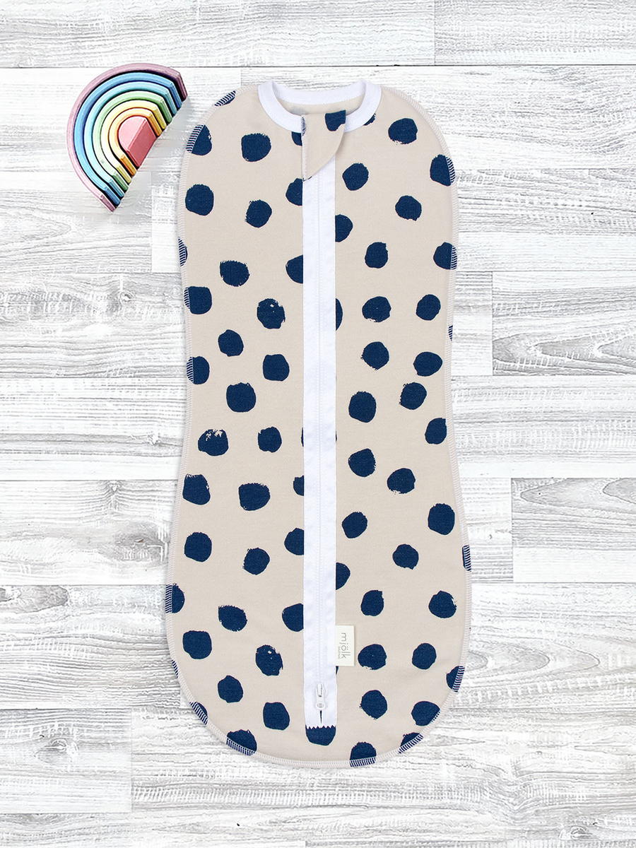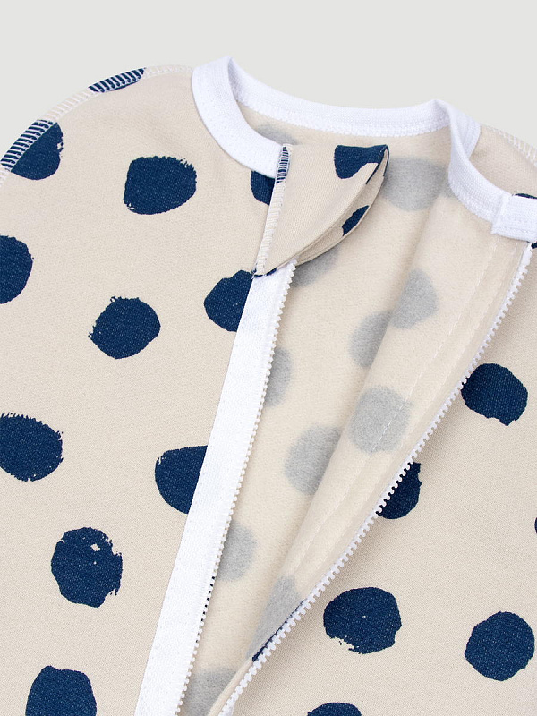 Утеплённый пеленальный кокон Mjölk [мьёльк] Горошки на молнии выполнен из плотного хлопкового трикотажа с небольшим, но тёплым и мягким начёсом на изнаночной стороне. Материал 100% хлопок, приятный на ощупь, согревает и не вызывает аллергии.