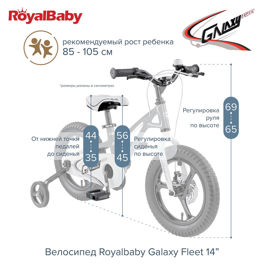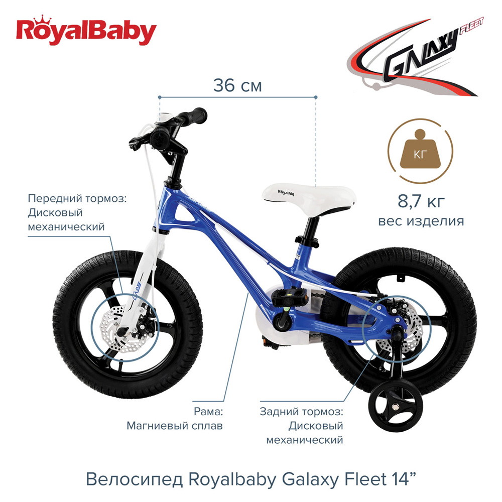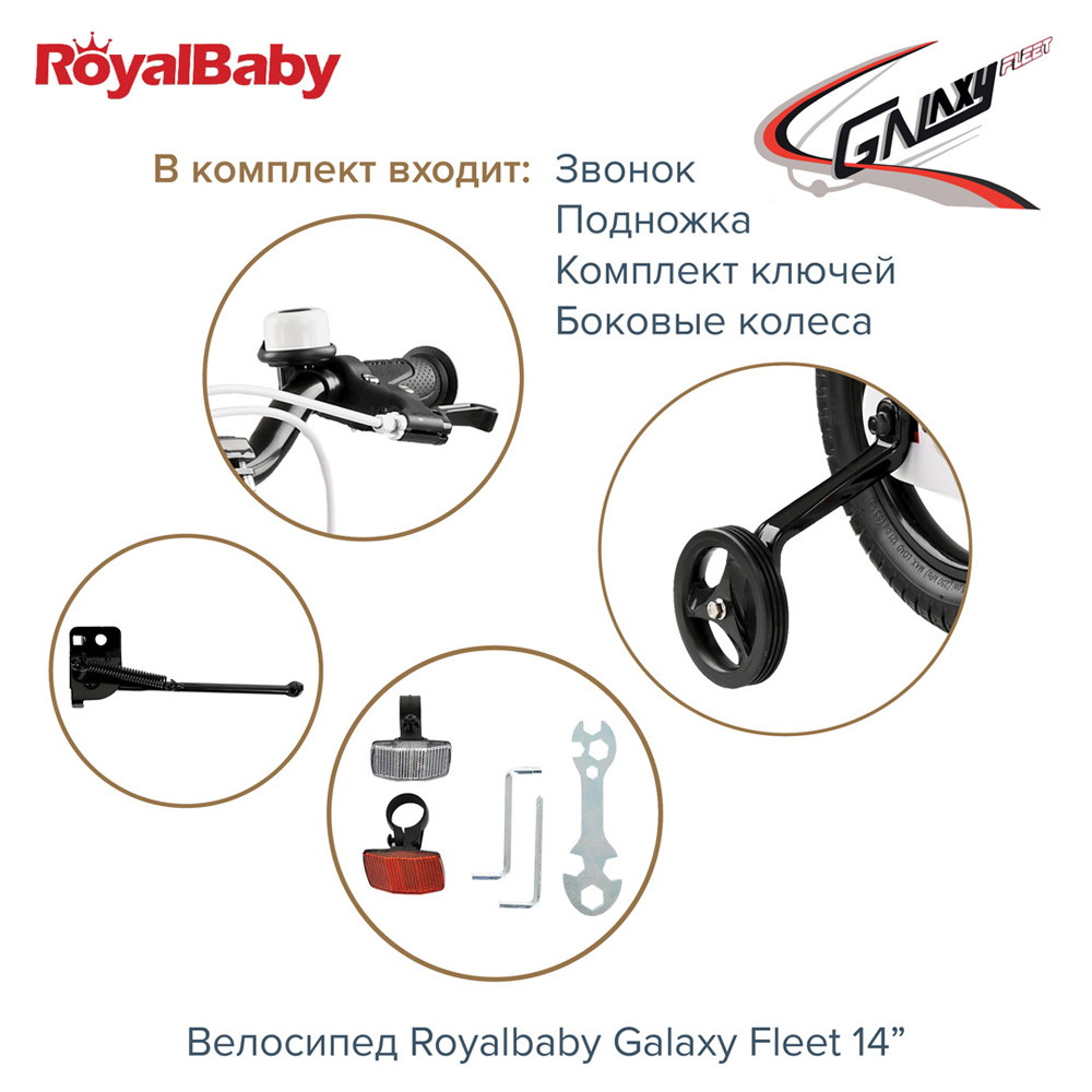 Велосипед двухколесный Royal Baby Galaxy Fleet 14" - детский велосипед порадует Вас своими функциональными особенностями, качественной сборкой, стильным дизайном и отличной ценой. Кататься на таком велосипеде комфортно и очень увлекательно. Galaxy Fleet обладает отличной маневренностью и практически бесшумной ездой по асфальту. Способен преодолеть высокую траву, песок и гравий. Просто незаменим при катании по городским улицам, парковым зонам и пересеченной местности. Galaxy Fleet станет самым запоминающимся подарком для Вашего ребенка.