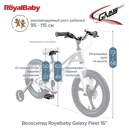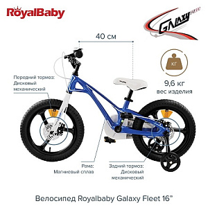 Велосипед двухколесный Royal Baby Galaxy Fleet 16" - детский велосипед порадует Вас своими функциональными особенностями, качественной сборкой, стильным дизайном и отличной ценой. Кататься на таком велосипеде комфортно и очень увлекательно. Galaxy Fleet обладает отличной маневренностью и практически бесшумной ездой по асфальту. Способен преодолеть высокую траву, песок и гравий. Просто незаменим при катании по городским улицам, парковым зонам и пересеченной местности. Galaxy Fleet станет самым запоминающимся подарком для Вашего ребенка.