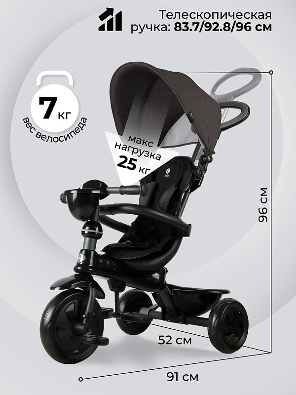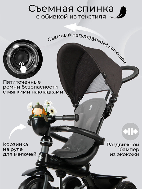Благодаря родительской ручке-толкателю, QPlay Cosy выполняет функцию прогулочной всесезонной коляски , обеспечивая комфортные поездки в любую погоду. Складной капюшон от солнца и ветра, мягкое кресло и пятиточечный ремни безопасности обеспечивают уют и надежность для малыша.