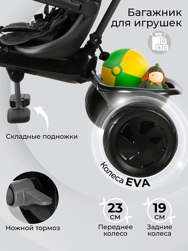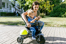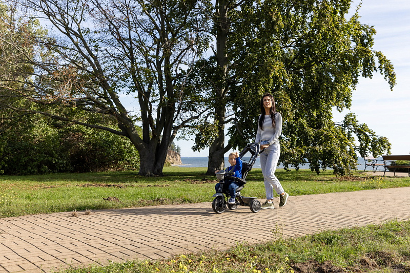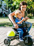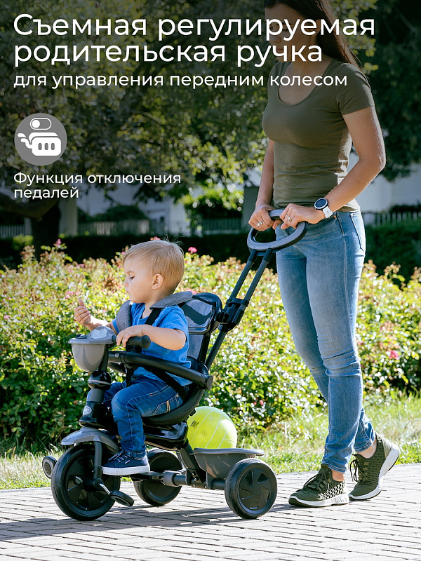 - 2 в 1: используется как коляска-велосипед с управлением для родителей и как самостоятельный трехколесный велосипед с ручкой.
