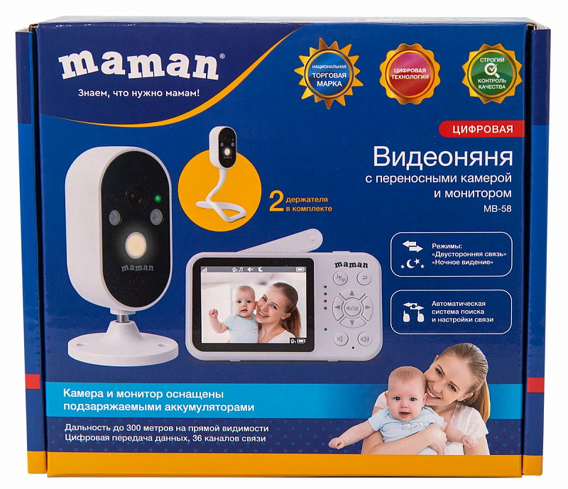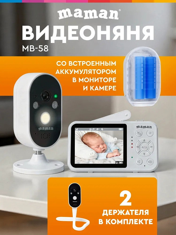 Среди множества одинаковых видеонянь предлагаем по-настоящему уникальное решение для безопасности ребенка: беспроводная видеоняня Maman MB-58 с аккумулятором в камере и мониторе. Она абсолютно автономна и предназначена для наблюдения за малышом на расстоянии до 300 метров, без wi fi и электричества. Можно поставить коляску в саду на даче, или на балконе. Аккумулятор емкостью 4000 мА/ч обеспечивает активную работу камеры до 16-ти часов. Важной особенностью данной модели является наличие сразу двух вариантов крепления камеры: гибкий держатель и магнитный кронштейн, что обеспечивает установку на любой поверхности как вертикально, так и горизонтально. Гибкий держатель – шлейф позволит надежно зафиксировать камеру практически на любой выступающей поверхности. Камера устанавливается на любую горизонтальную поверхность и крепится на вертикальную при помощи кронштейна. К любой металлической поверхности камеру легко и без усилий можно закрепить при помощи надежного магнита, который установлен в основании держателя. Удобный монитор с цветным дисплеем диагональю 2,8 дюйма и 2-кратным увеличением изображения (ZOOM) не занимает много места и поместится даже в карман одежды. А если вы вышли из зоны связи, то монитор оповестить вас световой и звуковой индикацией. Видеоняня проста в установке, интуитивно понятна в использовании и для ее настройки и функционирования не требуется интернет. Оснащена функцией двусторонней связи – возможность дистанционно общаться с ребенком. С родительского блока можно включать загруженные колыбельные и звуки природы (8 мелодий), управлять чувствительностью микрофона, громкостью и яркостью экрана. Видеоняня может работать в двух режимах: стандартный режим, при котором камера на постоянной основе передает изображение на родительский блок (монитор) и режим энергосбережения, при котором камера работает в фоновом режиме и не передает картинку на монитор во время сна ребенка, но мгновенно включается и начинает трансляцию изображения при малейшем шуме. Также стоит отметить еще одну важную функцию - режим ночного видения, которая обеспечивает наблюдение за ребенком в темноте при помощи инфракрасного датчика. В комплект поставки входит камера (детский блок), монитор (родительский блок), адаптеры питания 2 шт., кабели питания USB Type-C 2 шт., гибкий держатель для камеры, руководство пользователя. Видеоняня может стать также незаменимым помощником в наблюдении за пожилыми людьми, инвалидами или людьми, которым по какой-то причине требуется постоянный контроль и уход, а благодаря стильной упаковке и интуитивно понятному интерфейсу видеоняня станет замечательным подарком родителям на рождение малыша! Видеоняня Maman MB-58 является обновленной версией ранее популярной и завоевавшей доверие покупателей видеоняни Maman MB-08. С Maman MB-58 вы получите уверенность и спокойствие, зная, что ваш ребенок под надежным присмотром.