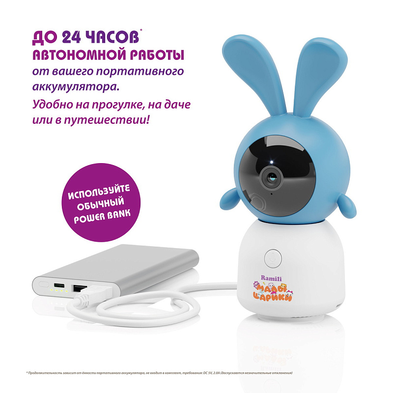 - Ёмкий аккумулятор в родительском блоке, заряжается с помощью адаптера питания или от вашего портативного аккумулятора Power Bank.