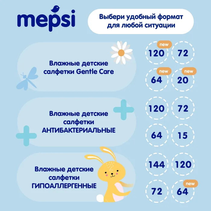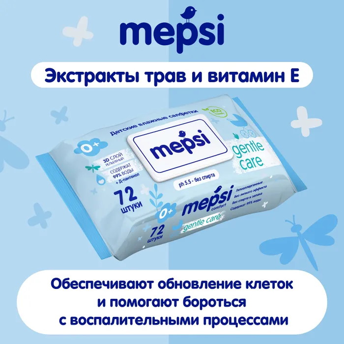 Влажные салфетки Mepsi Gentle care, детские, без спирта, 0 +, 99% воды + пантенол, 72 шт Влажные салфетки MEPSI специально разработаны для нежного ухода за малышами, которые уже начали активно познавать мир. Салфетки MEPSI незаменимый помощник для мамы в уходе и заботе о нежной коже малыша. Первые шаги и прогулка на свежем воздухе принесут больше удовольствия и радости, а кормление и простой гигиенический уход станут легче и удобнее. Салфетки также безопасны для новорожденных, нежно и бережно очищают, увлажняют и освежают кожу ребенка. Салфетки Mepsi изготовлены на основе натуральных материалов, имеют оптимальный размер, одной салфетки будет достаточно для использования.