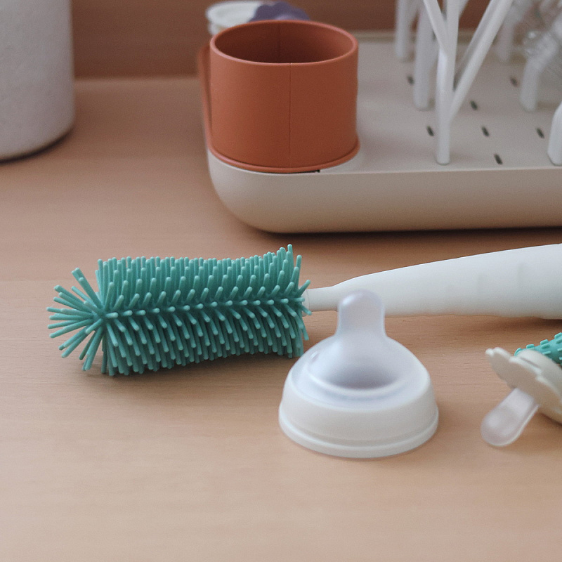 - Мягкие силиконовые щетинки деликатно очищают поверхности бутылочек и сосок, не царапая их